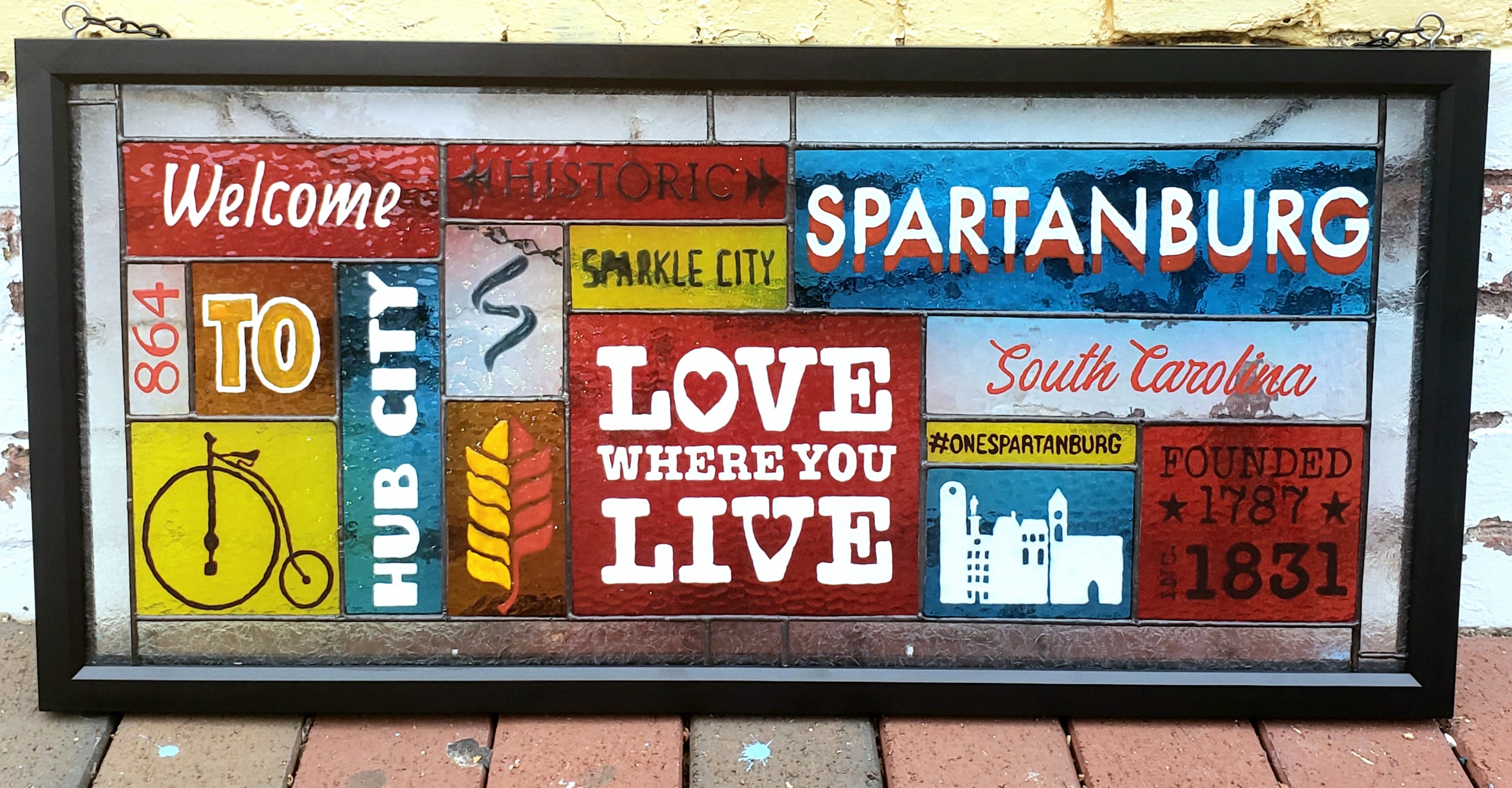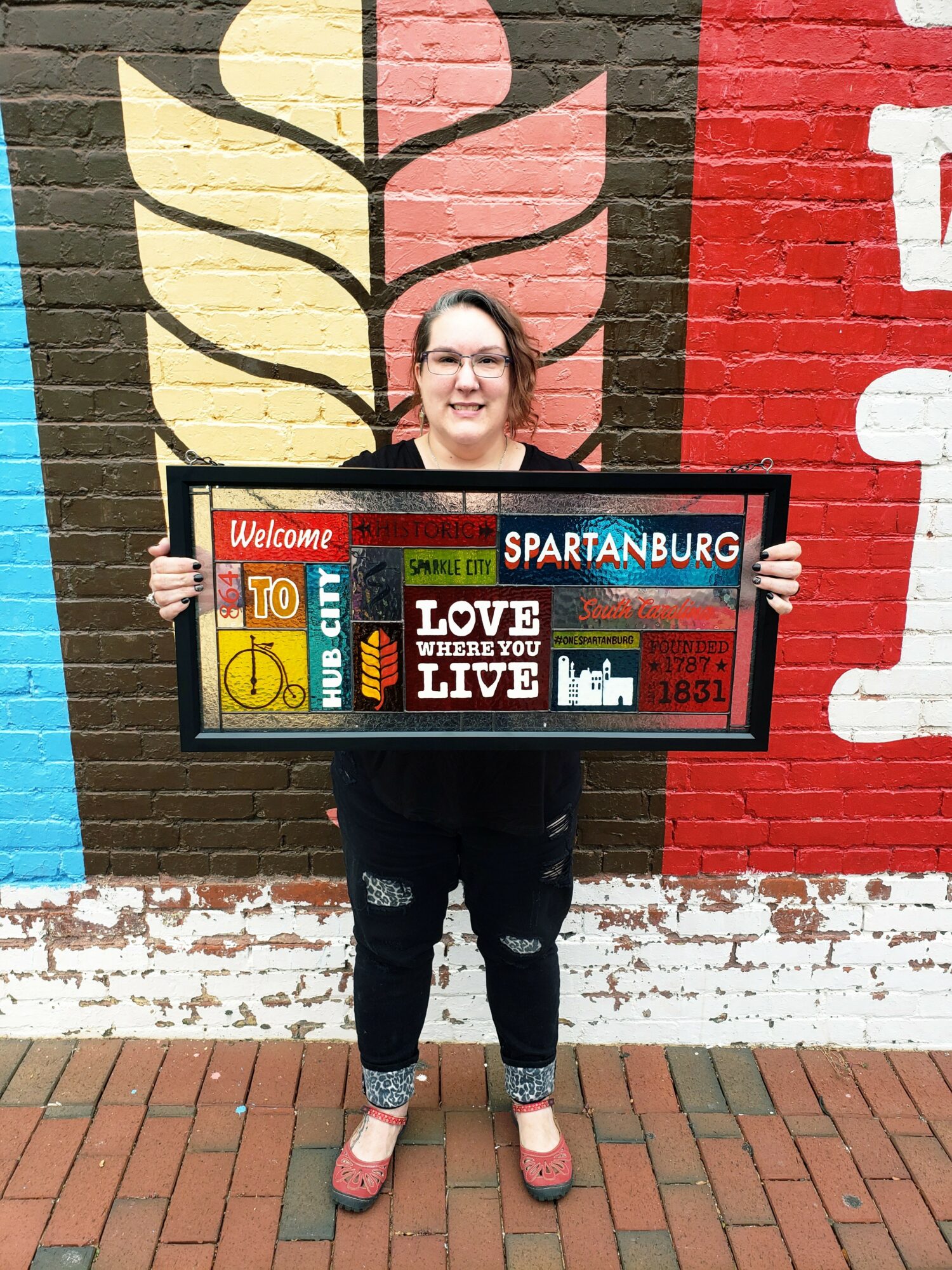As an artist, I’m known for the ability to learn multiple mediums and to be able to create almost anything. I think one of my strengths has always been being able to get an idea for a creation and letting that vision dictate what medium it’s made from – and if it’s not a medium I’m familiar with, I teach myself or take a class to learn how to work in that medium to be able to fulfill the vision. I feel that sets me apart from others. As far as what I’m most proud of, my favorite piece I’ve made so far is recreating the well known Love Where You Live mural in Spartanburg in stained glass, down to hand painting the lettering and details.