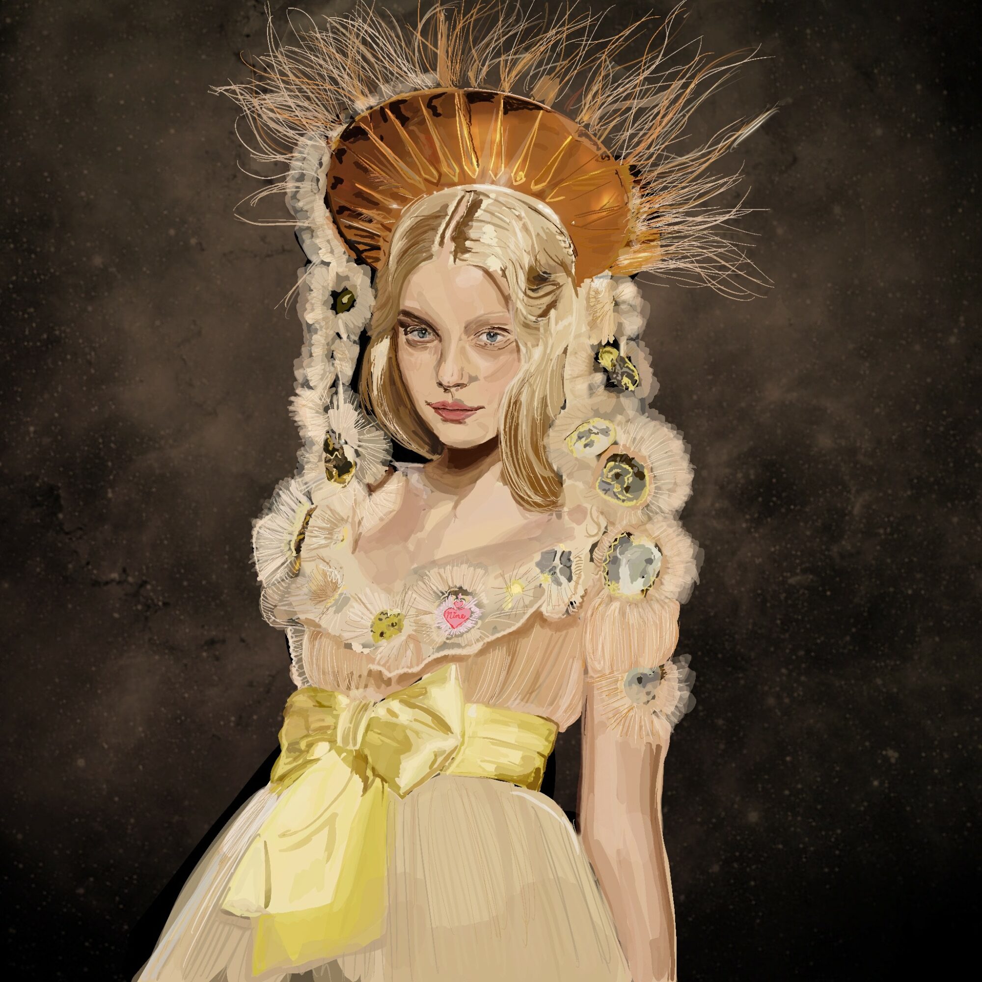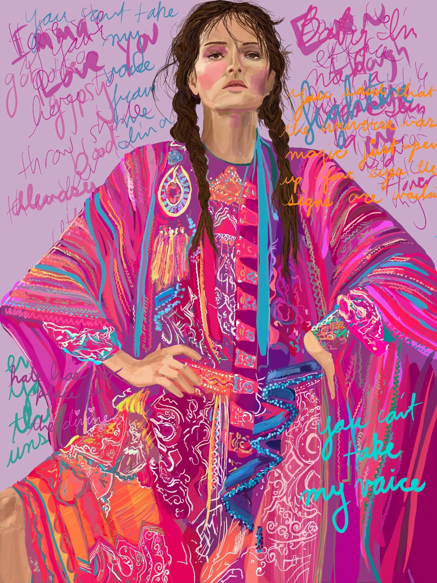 I specialize in spiritual portraiture, exclusively of women exploring the divine feminine while questioning social norms and historic archetypes. When a piece starts it’s typically inspired by a song. I get obsessed with two or three tracks that capture what I’m sorting through in my own psyche and gives me a way to relate what I’m processing in a way that will hopefully translate universally. I paint the entire first piece listening to those three songs on repeat feeling the lyrics take shape visually with a color palette inspired by the melodies. I prefer to work in series to make a cohesive body digging into the emotions and hand ending up with triptychs or my largest has been twelve series piece portraying relationship dynamics via animal heads on human bodies and their language in relation to each other, I’m very proud of a nine piece Chakra series I did embellishing on the throat and crown chakras as well as a spirit animal seven piece series. My favorite standalone painting is called “Mother’s Day” portraying a Native American woman and her generational relationship to the earth and spirit realm.