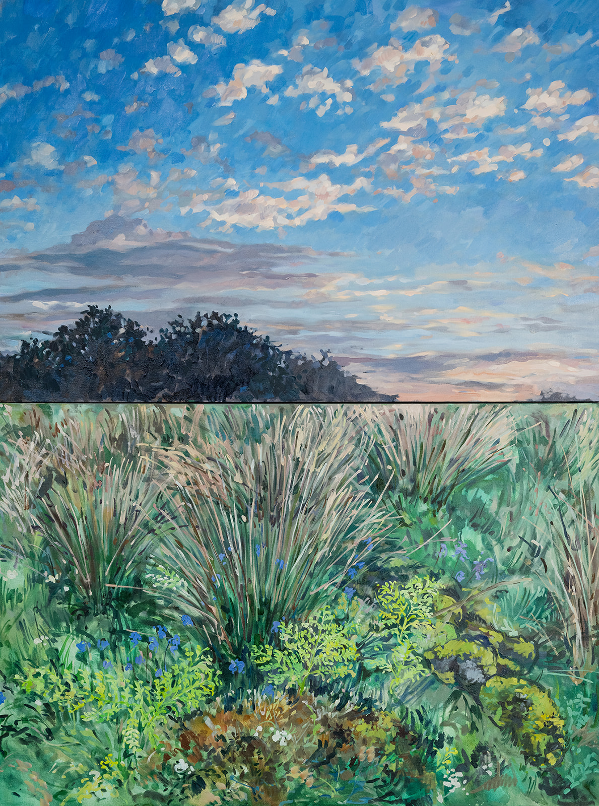 I moved from Greenville to Savannah, GA to study Painting at the Savannah College of Art and Design in their MFA program. It took me a while to adjust to a different topography, different plants, different clouds, since I was painting the views around me. I was lonely and a little scared having moved there all by myself, and would drive out to the coast and spend time looking at the marshes. I eventually fell in love with them and with the new city. I painted the landscape during my two years there, developing a diptych (two panel) format with sky on the top panel and the ground on the bottom panel. It was a new way for me to explore the landscape, but also to talk about the metaphorical meanings of heaven and earth, spirit and matter, the sacred and profane.