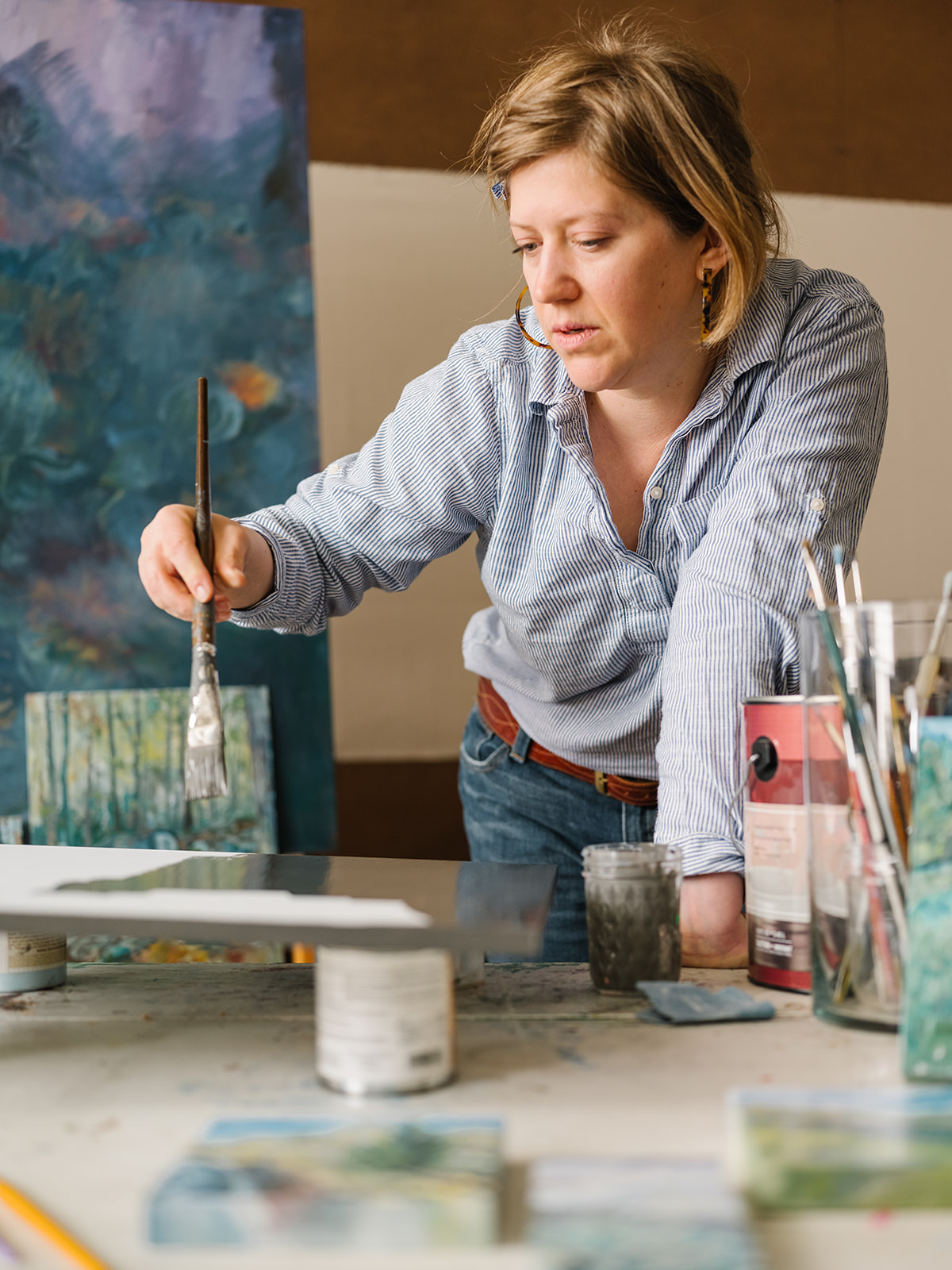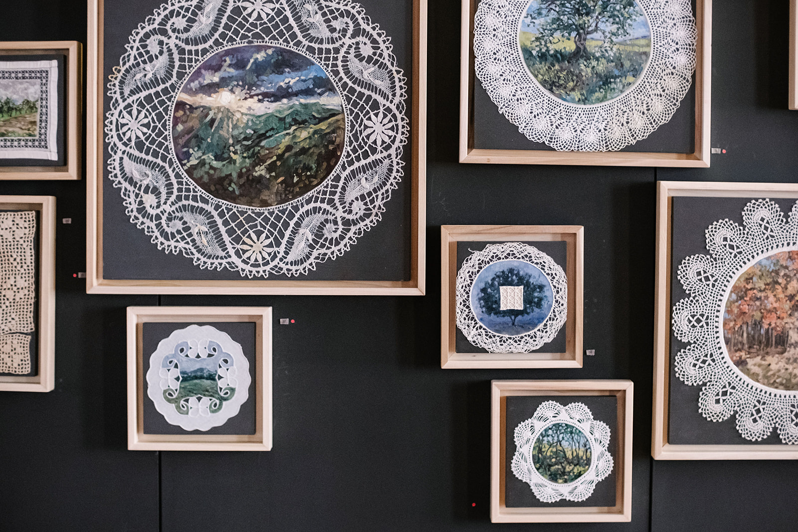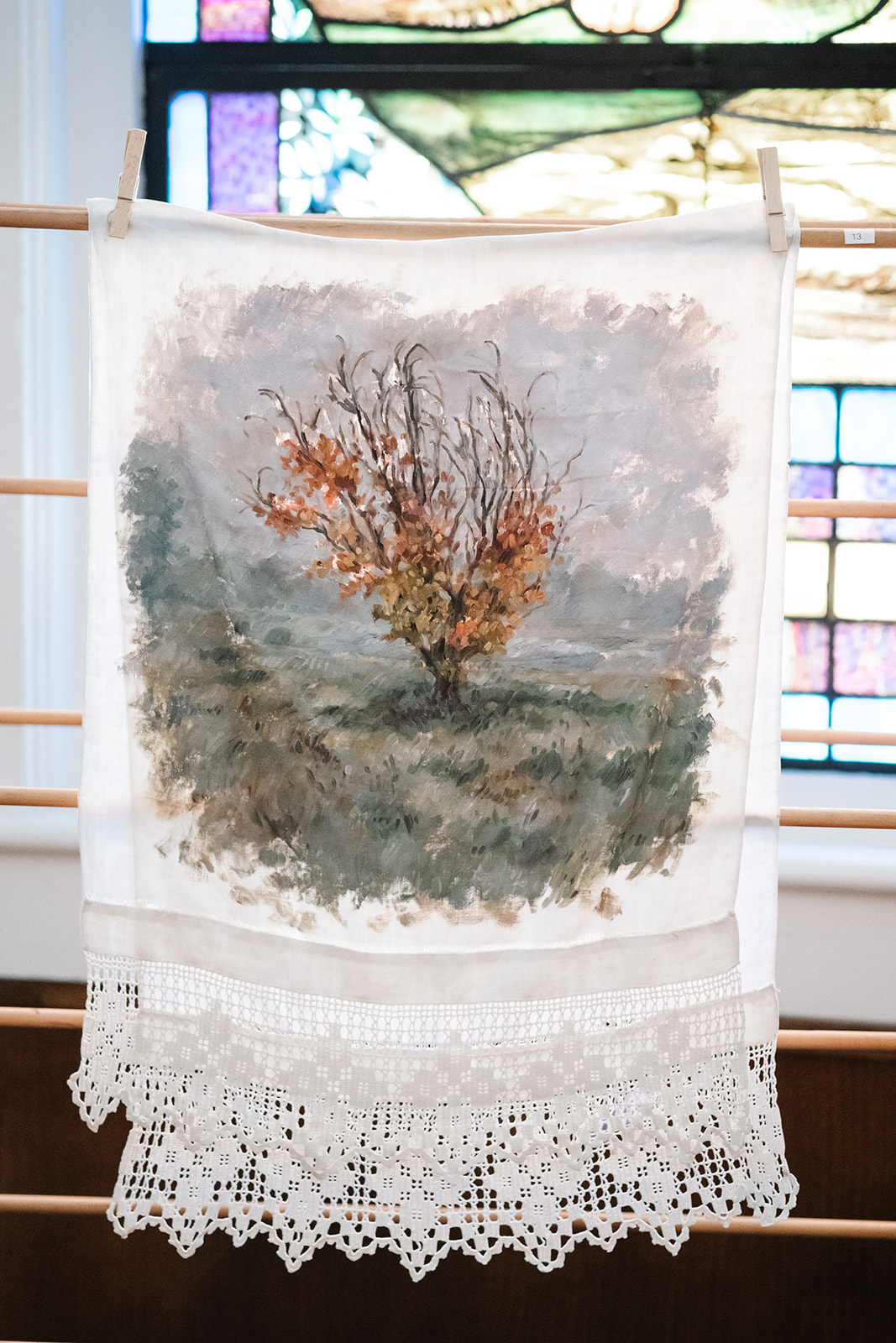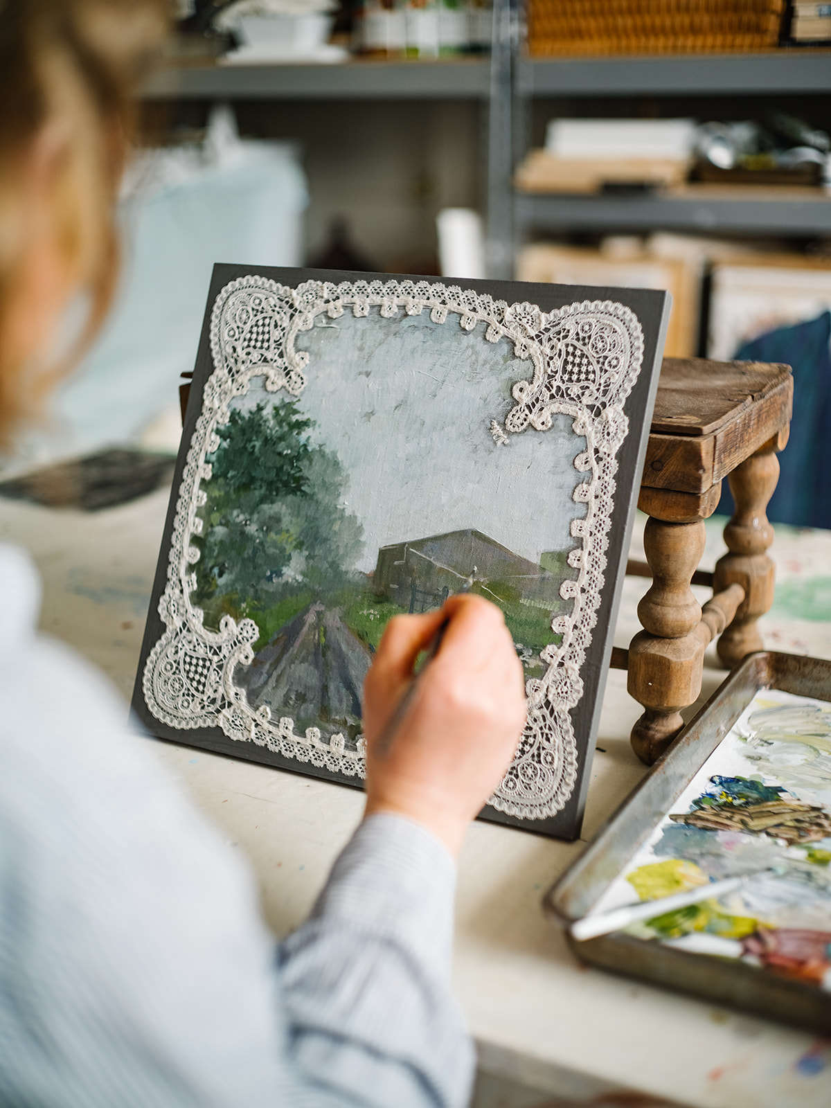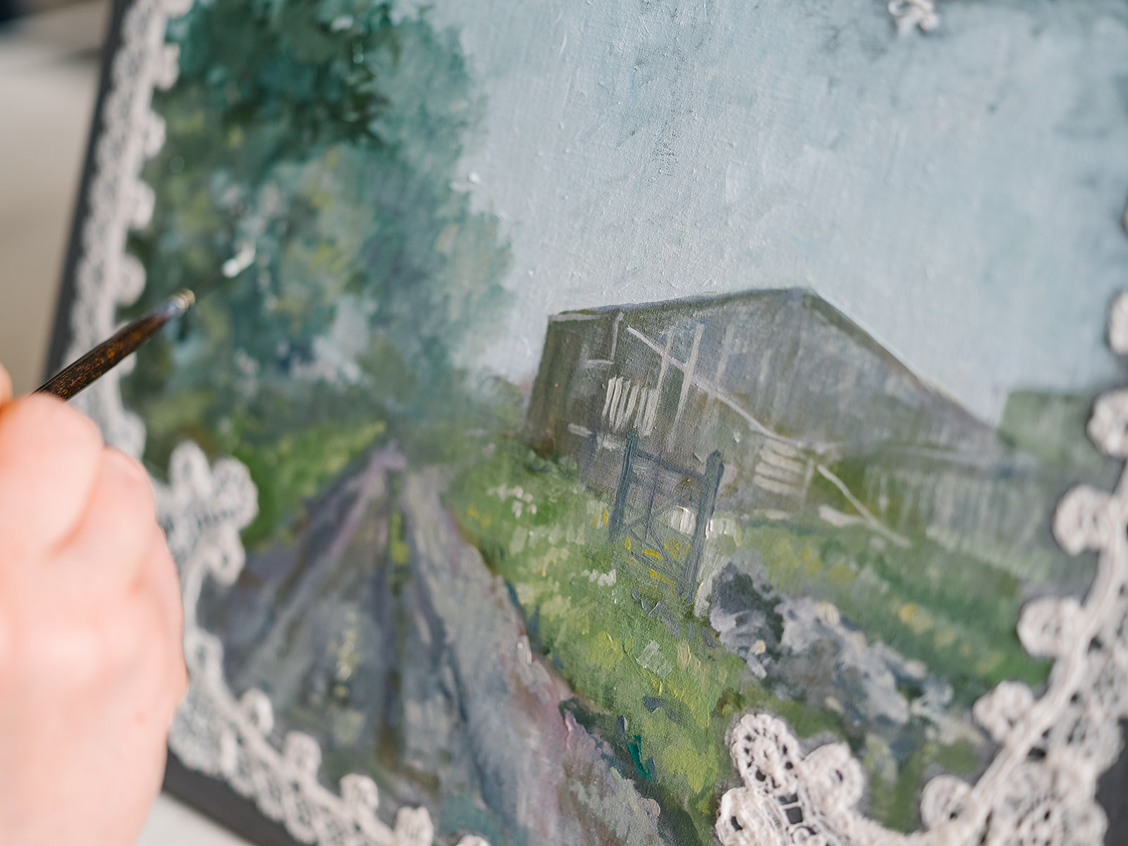 The work I make now weaves together my love for traditional landscape painting with my love for textiles and textile processes. Combining these two kinds of making allows me a metaphor to talk about the way I have worked towards weaving together my role as a professional painter and my role as a mother. I’m always looking for ways to combine landscape painting with textile processes. I paint landscapes on doilies, I paint on canvas then fold and smock the paintings, I cut up paintings and piece them together like a quilt. I think it’s important to me to keep speaking about the combination of art-making and motherhood. Each enriches the other in my life.