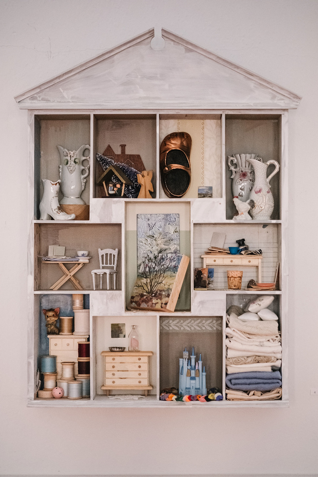 So I did return to the studio, but instead of painting landscapes I made collage/assemblage pieces with vintage textiles and dollhouse furniture, tiny things I had collected. I started making art about what my life was then–not expansive outdoor vistas, but domestic repetitions, tiny vignettes of indoor life.