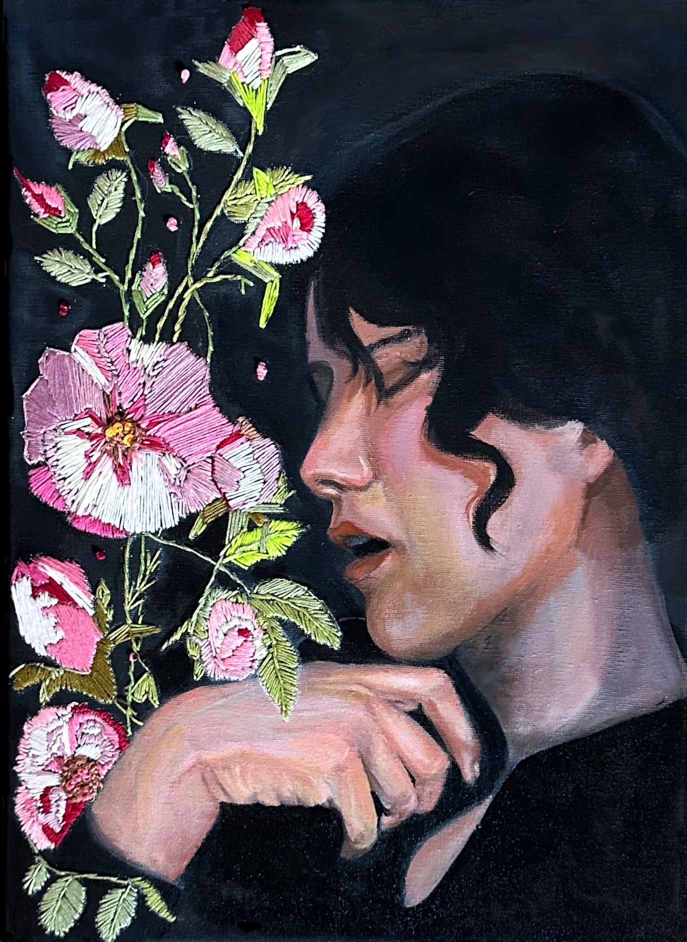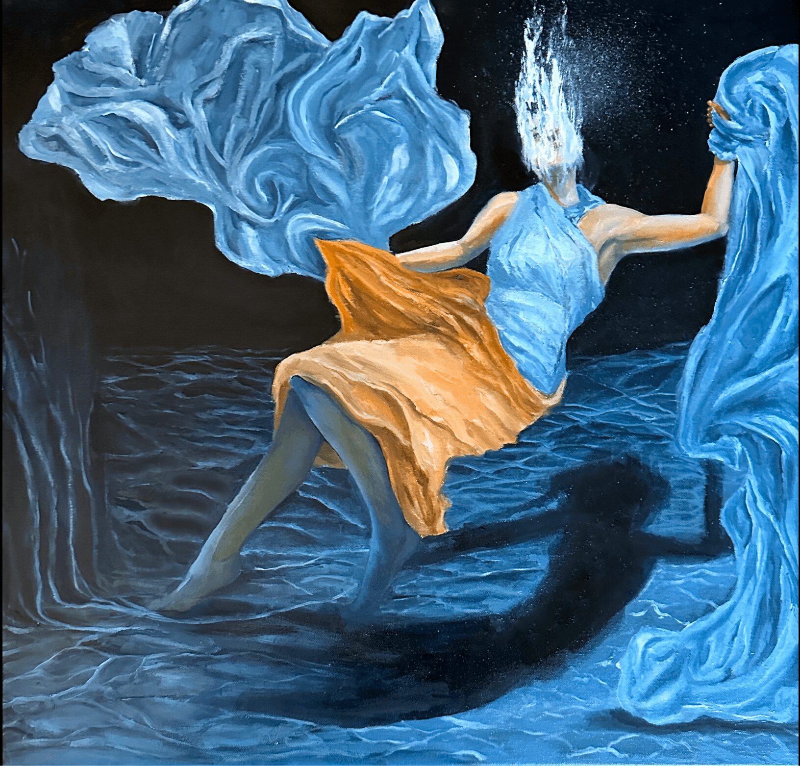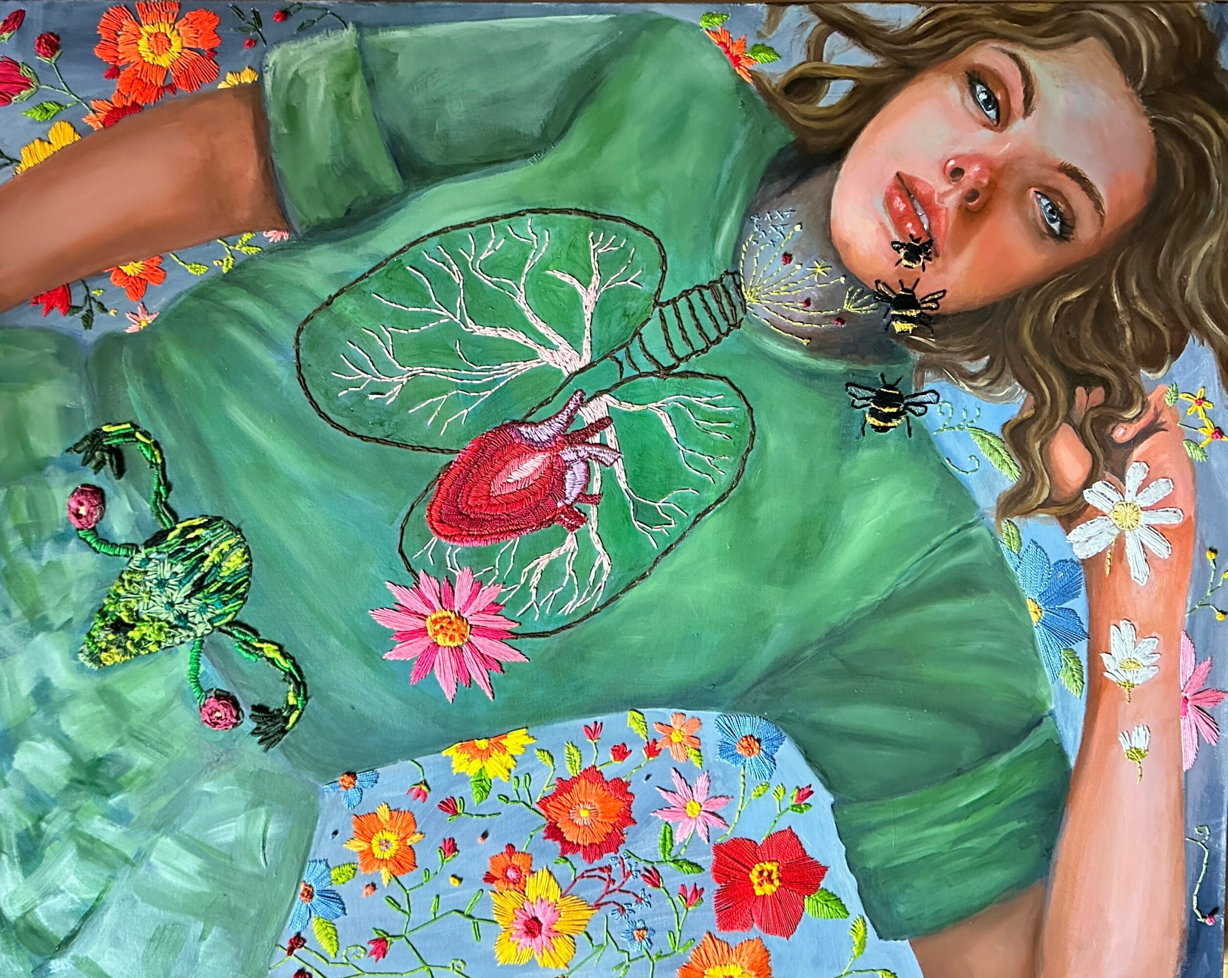 I create oil paintings that explore themes of identity, mythology, nature, and art history. My work intertwines personal and cultural narratives blending symbolic imagery with storytelling. I draw inspiration from historical traditions such as folk tales, female and cultural politics, and legends. I consider myself a contemporary portraitist in the style of expressionistic surrealism. Recently I have introduced sewing into my paintings with the idea of reinvigorating the humble “women’s craft” and raising it to a higher level of art.