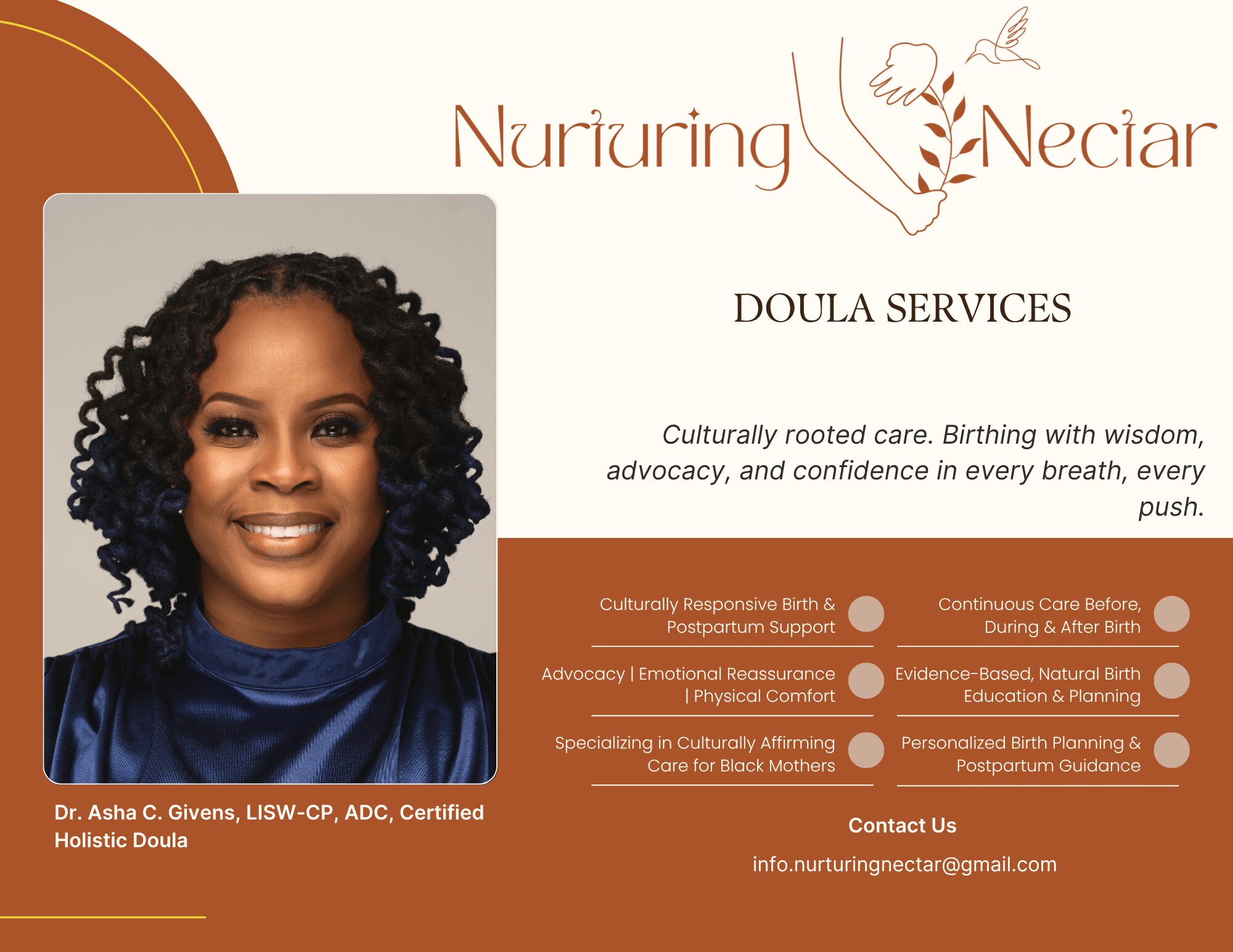 Nurturing Nectar Doula Services is one of the four pillars of The Givens Collective, alongside Counseling, Coaching, and Consulting. My doula care goes beyond birth support, it’s a culturally responsive, holistic journey designed to empower mothers to approach labor, birth, and postpartum life with confidence and calm. I provide a steady, grounded presence before, during, and after childbirth, offering physical, emotional, and informational support tailored to each individual’s unique journey. From guiding breathing techniques and optimal labor positioning to providing evidence-based education on labor stages, medical and non-medical interventions, comfort measures, and postpartum care, my goal is to help reduce fear, promote confidence, and create a calm environment that supports the natural rhythm of the body.