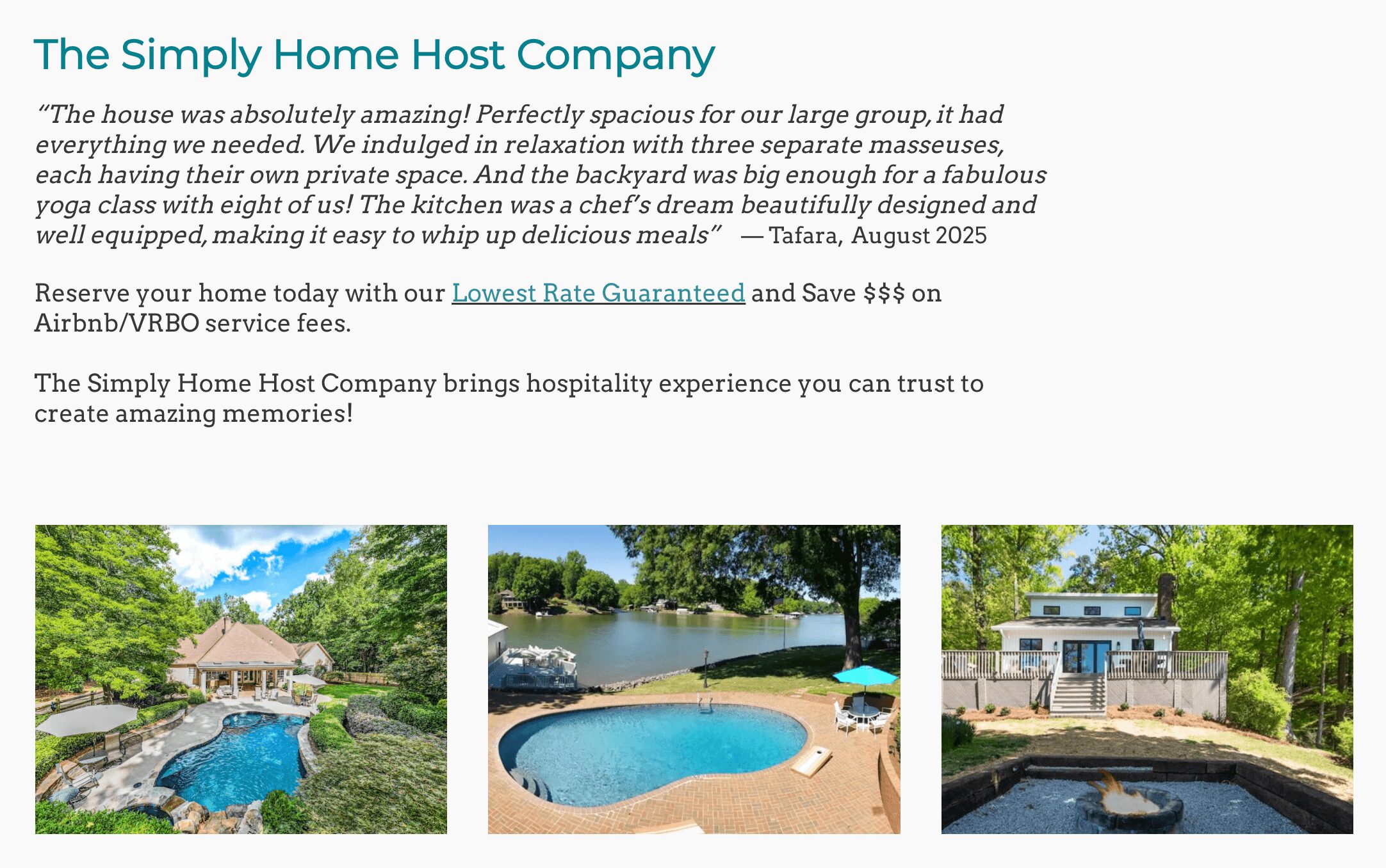 This isn’t a call center operation. When something needs attention, I’m not dispatching a ticket into a queue. I’m personally invested in every property I represent, every guest experience we create, and every owner relationship I’ve built. That level of care is baked into our name. Simply Home. We want every guest who walks through one of our doors to feel like they’ve arrived somewhere that was genuinely prepared for them, not just cleaned and checked off a list.