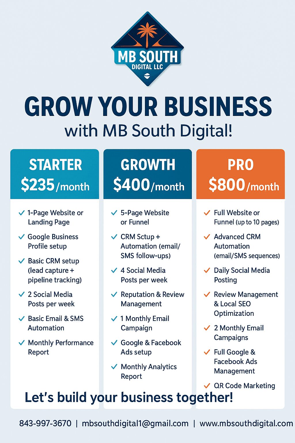 • Starter Package – $235/month Perfect for new or small businesses just getting started online. Includes website setup, social media management, and basic SEO support.