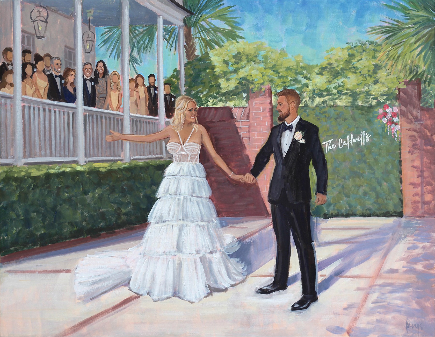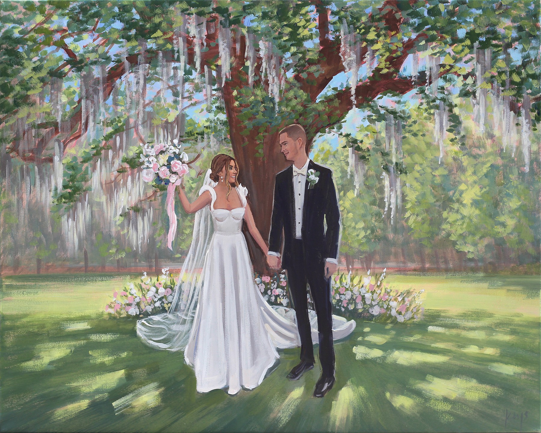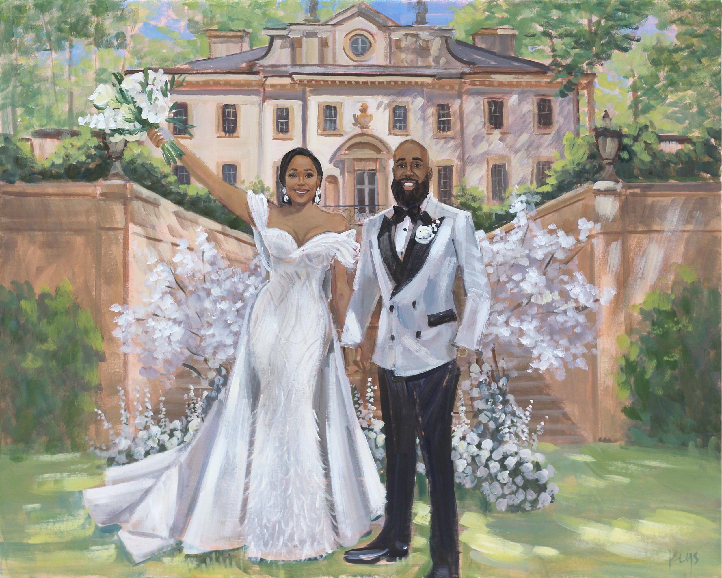 I am a Live Wedding Painter based in Charleston, SC. What’s unique is I was one of the first Live Wedding Painters to launch this niche and have been painting weddings since 2011. Prior to painting weddings, I was represented by galleries and my coastal landscapes collected on the east coast. My first out of state wedding happened about 3 months into launching, and today, most of my weddings are out of state. Though that’s the case, our Charleston weddings are so, so special and we’ve made an intentional effort to dedicate a portion of the calendar to our local Charleston weddings. Over the years, couples have gravitated and chosen me as their artist for my emphasis on facial details along with my paintings being true to color when it comes to the landscape and architectural details. And the dress details, too! (Jen worked for a wedding gown designer prior to us getting married, so the dress details have always been an important part of our creative process, too!) We love that these paintings capture couple’s favorite aspects and details of the venue, too! Whether it’s a luxury estate or a beautiful landscape, both make for strong painting backdrops! When I first began, I painted figures very small … but as you can see today, the couple is by far the center of each painting!