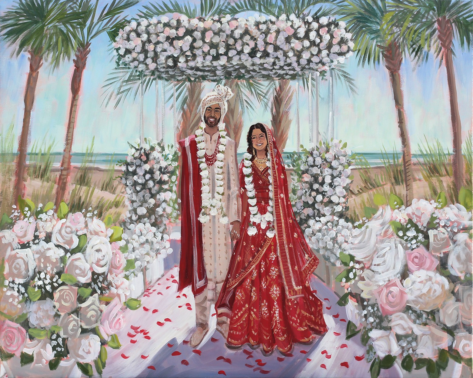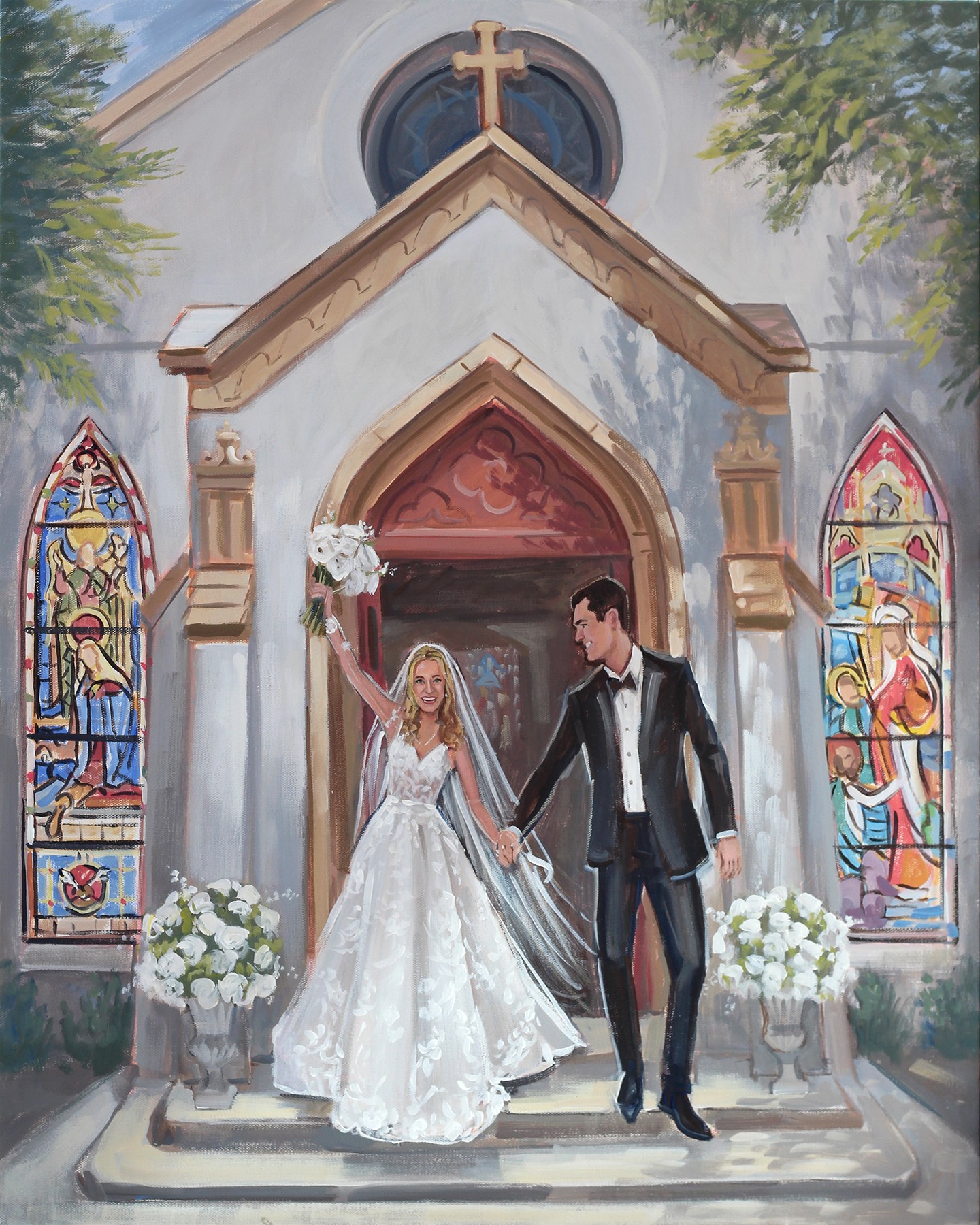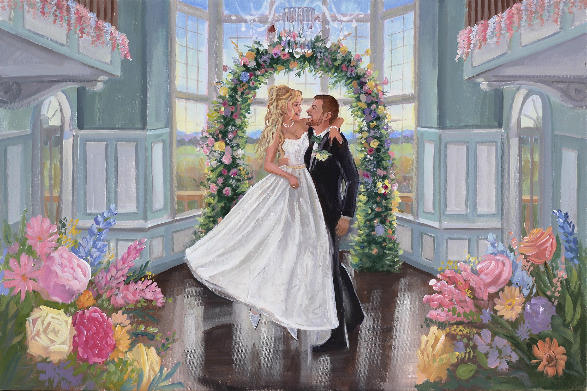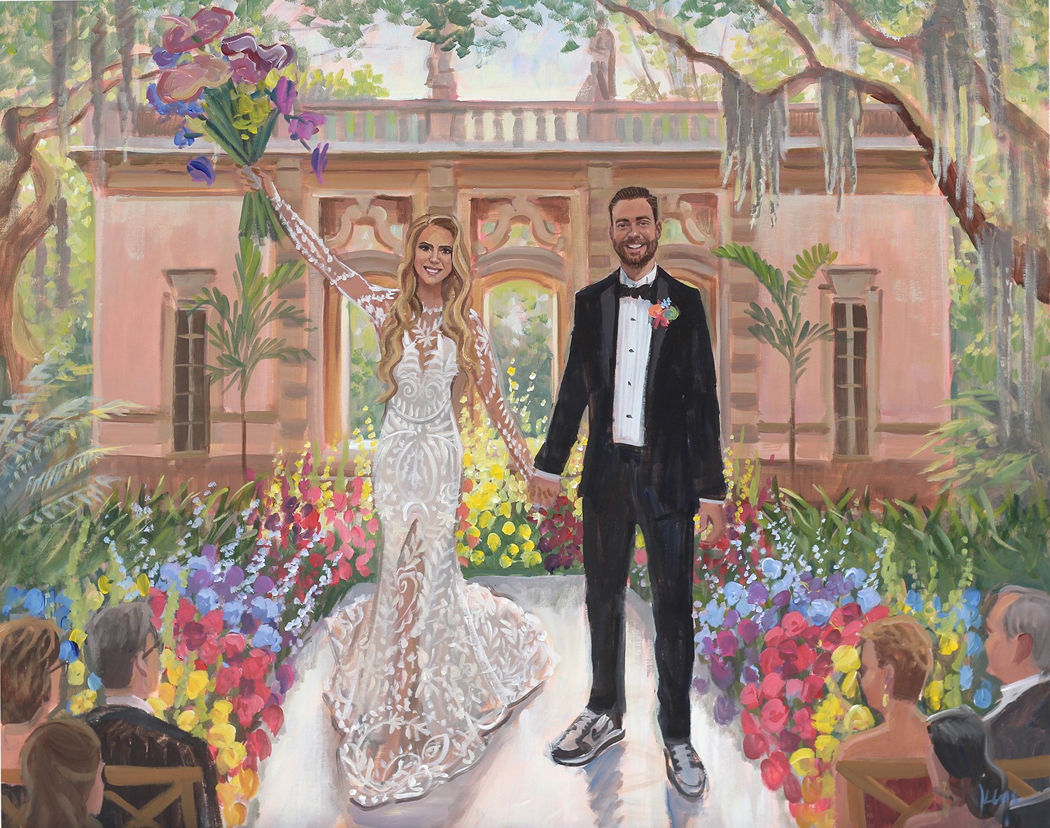 I am a Live Wedding Painter based in Charleston, SC. What’s unique is I was one of the first Live Wedding Painters to launch this niche and have been painting weddings since 2011. Prior to painting weddings, I was represented by galleries and my coastal landscapes collected on the east coast. My first out of state wedding happened about 3 months into launching, and today, most of my weddings are out of state. Though that’s the case, our Charleston weddings are so, so special and we’ve made an intentional effort to dedicate a portion of the calendar to our local Charleston weddings. Over the years, couples have gravitated and chosen me as their artist for my emphasis on facial details along with my paintings being true to color when it comes to the landscape and architectural details. And the dress details, too! (Jen worked for a wedding gown designer prior to us getting married, so the dress details have always been an important part of our creative process, too!) We love that these paintings capture couple’s favorite aspects and details of the venue, too! Whether it’s a luxury estate or a beautiful landscape, both make for strong painting backdrops! When I first began, I painted figures very small … but as you can see today, the couple is by far the center of each painting!