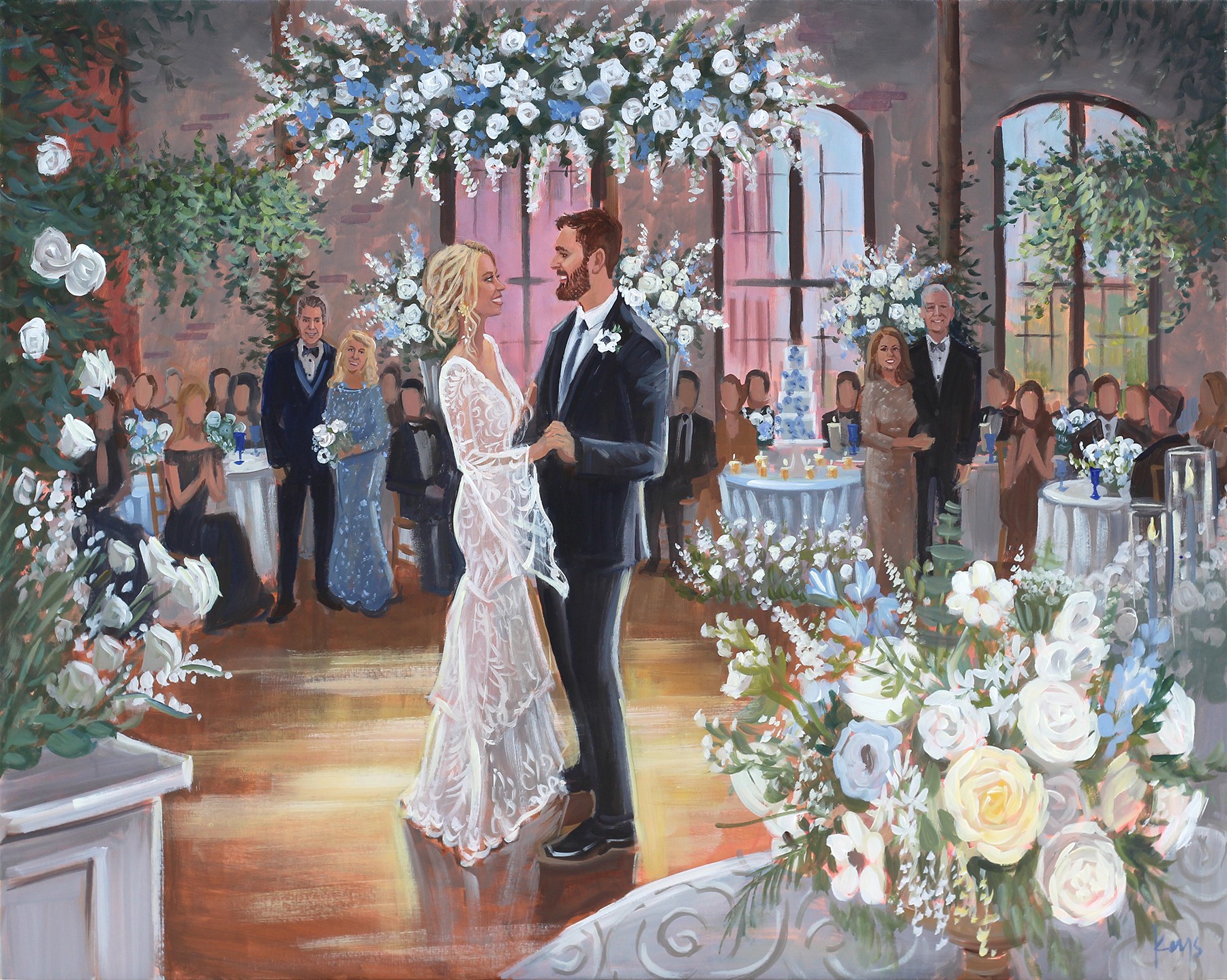 After deciding to make a somewhat dramatic career shift from marketing to become an artist, I went back to school to study painting at The School of The Art Institute of Chicago, and then in Italy, and afterward, moved to Wrightsville Beach, NC to create paintings for private collectors and galleries. My Uncle was a custom home builder there, and he hired me for my first commissioned series, painting the historic cottage architecture of Wrightsville Beach homes. It took off from there with my coastal landscape paintings … and ultimately, that’s how I met my wife, Jen! (She saw one of my paintings hanging in an office and asked who the artist was.) Shortly after Jen and I met, I received my first live wedding painting job. At the time, Jen was also involved in the bridal gown side of the wedding industry, and even she had not heard of this idea of a “Live Wedding Painter.” In 2011, I painted my first wedding live, and from there it grew to where we are today! I’ll never forget Jen saying after responding to that inquiry, “how crazy would it be if you traveled the world painting weddings?” Fast forward … over a decade of live wedding paintings and over 500 weddings painted across the USA, in England, and Portugal!
