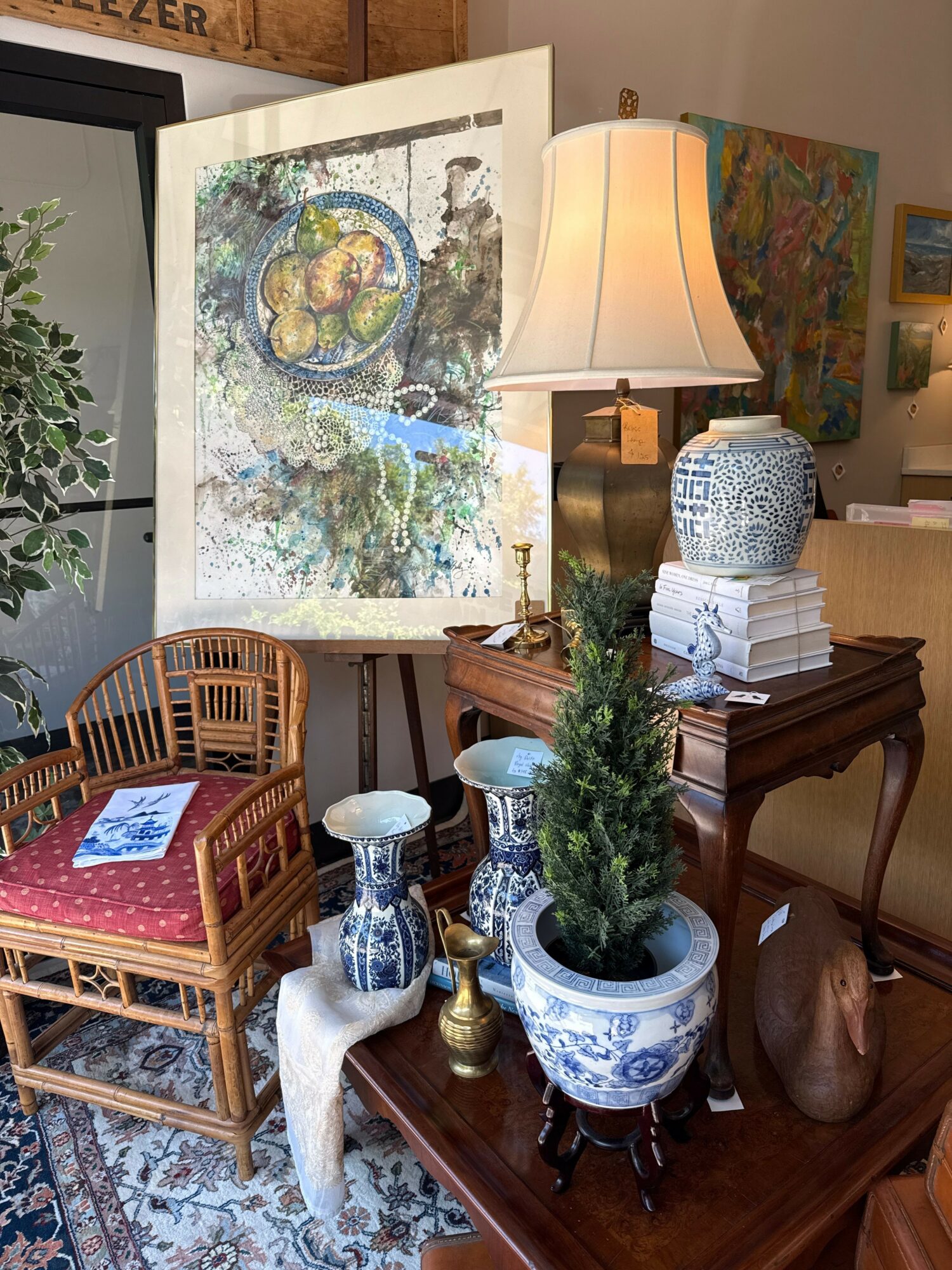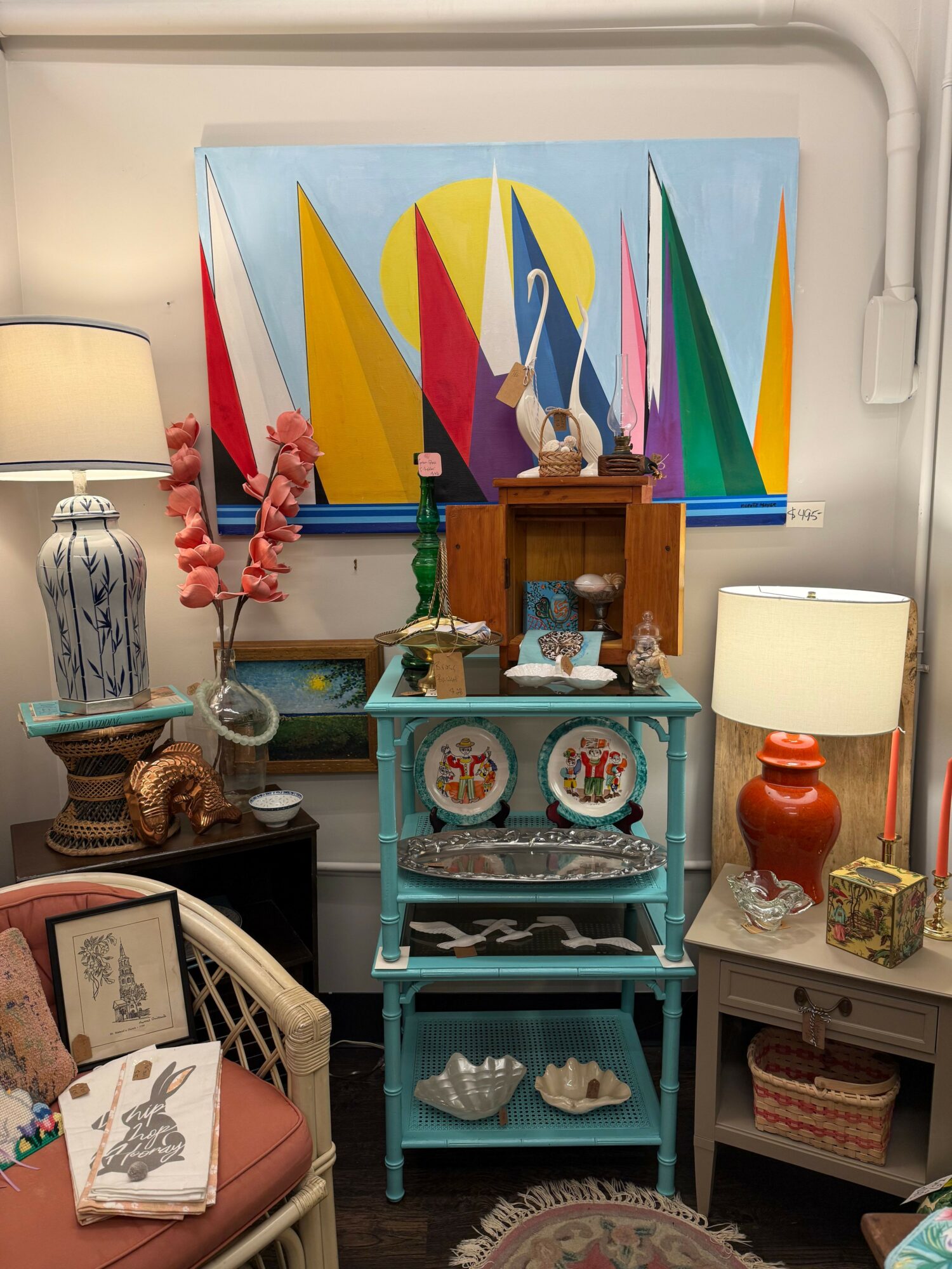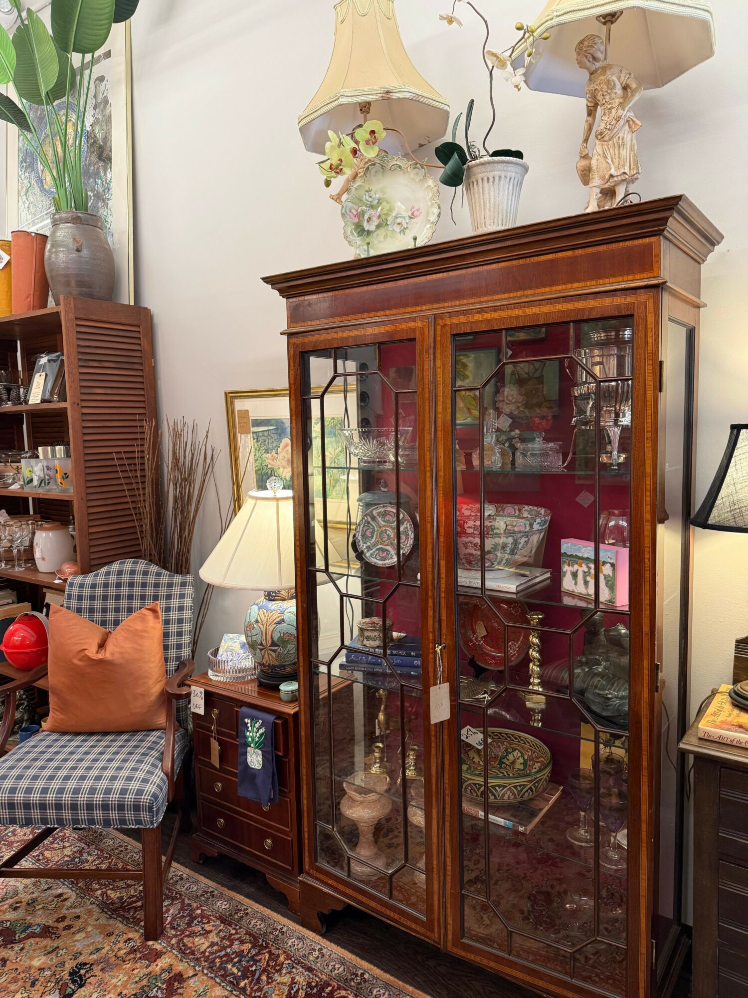 I have always worked where I can be creative. It’s not just about collecting and selling. It’s about knowing how to put it together and making it shine. The design aspect is a big part for me. My store is complemented often for having beautifully displayed pieces. It makes a difference in people wanting to come to see you. I am known for having a strong sense of color. Whether it’s in interior design or gardening, there has to be lots of color. I don’t really specialize in a specific period. I like to mix it all.