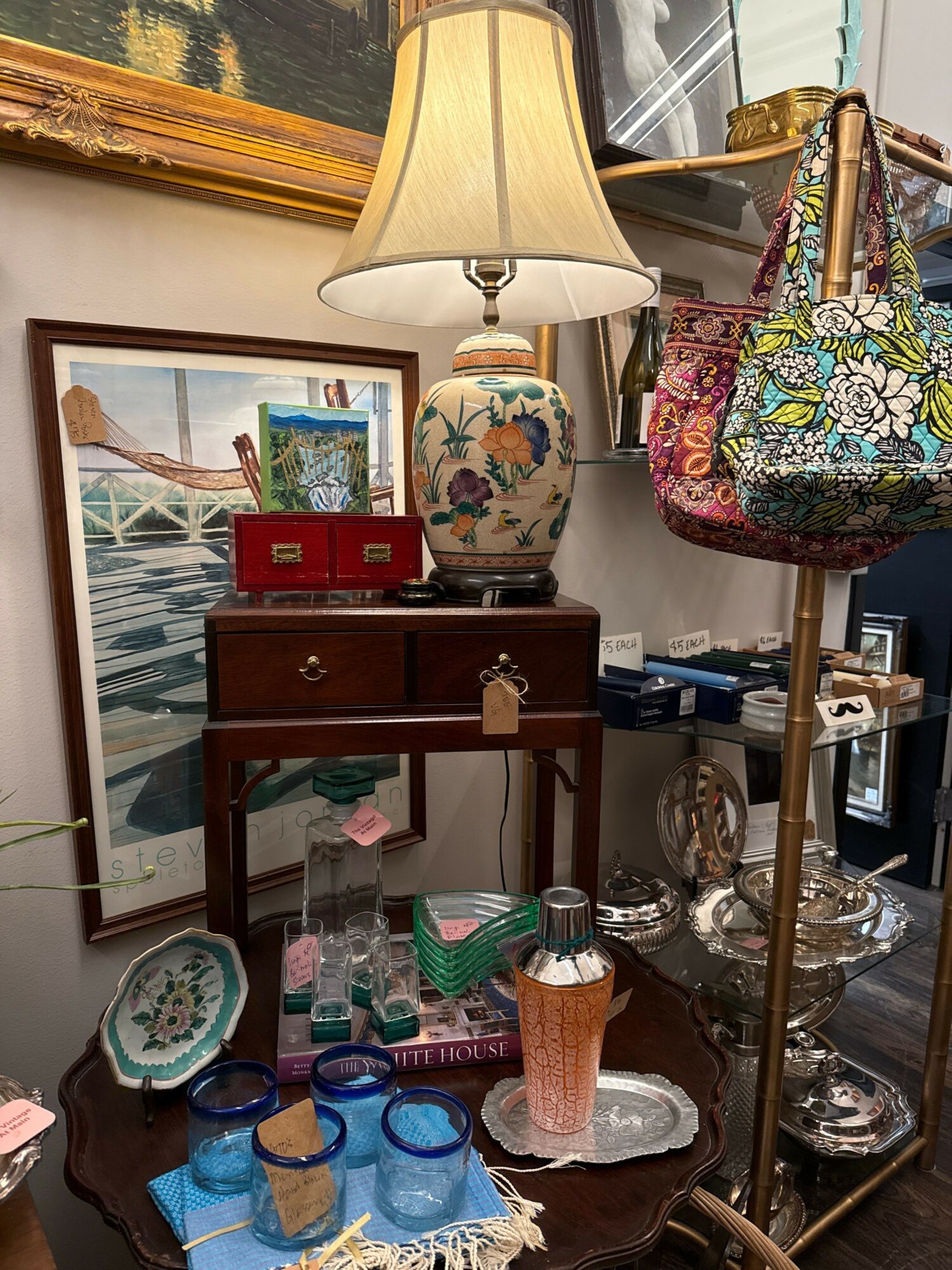 I have always had a love for beautiful old things. I learned at an early age to appreciate the quality and history vintage and antique pieces hold. My great grandfather worked in fine furniture factories in the mountains of North Carolina. My father did upholstery work, so I came by my love for timeless quality easily. In the early 2000’s, I had the opportunity to buy my first store and this wild ride began. Shortly after opening my store, I began working at an auction house that was actually next to my store. . The knowledge I gained on top of what I already knew was immeasurable. I started an estate sale company in 2005, which is still in operation. I have spent the last 25 years collecting and selling treasures of all types. Once you have the itch for this, it never goes away. The hunt is a little harder these days as more young people fall in love with vintage. It’s a wonderful thing to see though. My current store The Vintage At Main is located in Downtown Greenville. I like to call it an eclectic curated mix. We primarily focus on vintage decor and furniture with some antique items. As well as highlighting local artists, and estate liquidations..