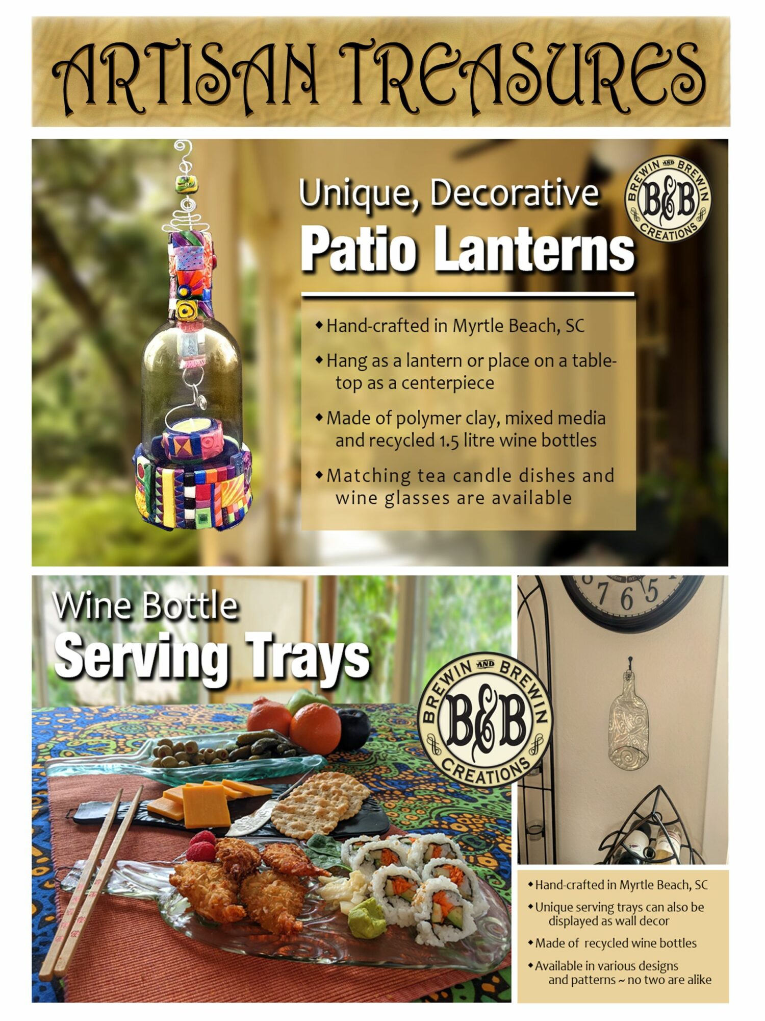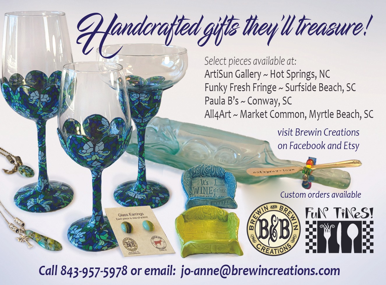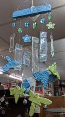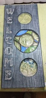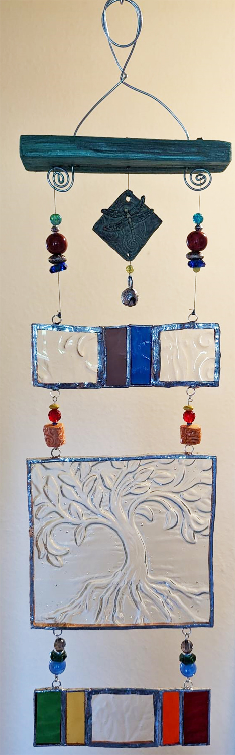 I’ve been a musician all my life, and continue to perform in theaters internationally. My husband and I are tribute artists, so acting and choreography mixed in with playing an instrument and singing. Its fun because with one phone call we could find ourselves anywhere in the world ~ but mostly the U.S. I’m a retired behavior therapist (specialty ~ low functioning, aggressive acquired brain injury adults). Interestingly both of these two careers require creativity and art. While at home between the road and the rehab residence, I was learning various crafts … Ukrainian egg decorating, wood burning, sewing commercial and industrial, advanced knitting etc. I’ve always been a sponge for learning new things ~ yep, a Sagittarian! I hit a huge learning curve in 2016, spreading myself out in as many art directions as I could handle … batik, glass fusion, ceramics, mosaics and ceramics pottery, candle making, hand stamping flatware, polymer clay. Since then, stained glass & soldering, resin work, soda can die cuts, soap-making … and the list continues. I think I’m most known for taking apart wine bottles, and converting them into patio lanterns, sun catchers and wind chimes. I’m also known for my polymer clay cane covered wine glasses. I love making actual mixed media creations ~ combining soda can shapes, to glass fusion (wine bottle parts melted into themed textures), air dry clay, stencils & tile adhesive, old household pieces, broken jewelry, shard glass, anything! I can have an idea of what I’m about to create, but its inevitable that the project will take on a life of its own. My role is to channel the creation … from the buyer’s idea/desire, through me to the best of my ability, back to customer in physical form. I love the way this works!