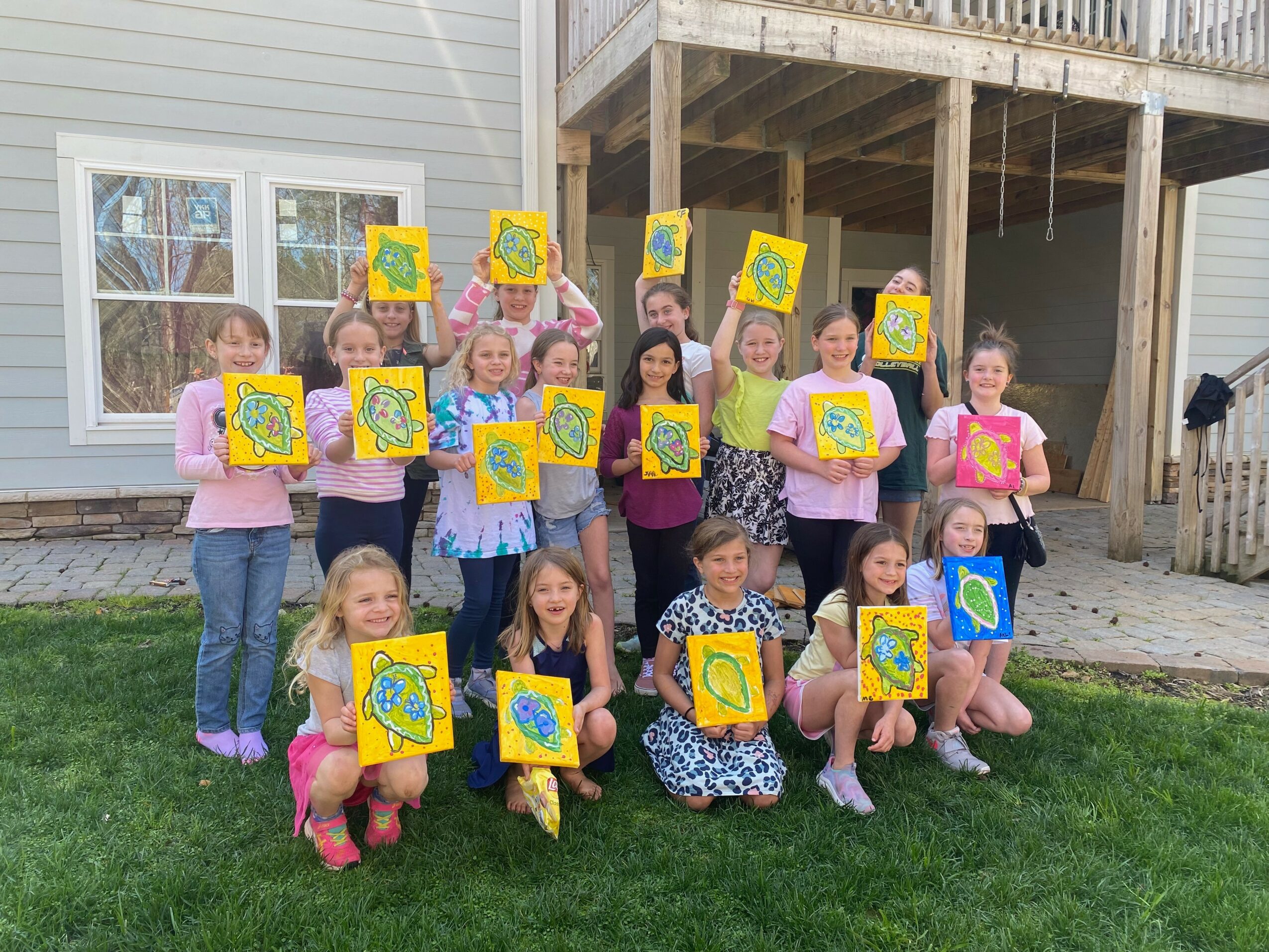 I have been teaching paint parties for seven years now. I teach every week at the arts center in town and a few other venues occasionally. I travel to homes for private birthday parties, girls nights and other parties. I also conduct team-building events at businesses. Three years ago, I started a kid’s summer art camp for one week in the summer. I also offer online classes occasionally and sell art kits for people to paint at home.