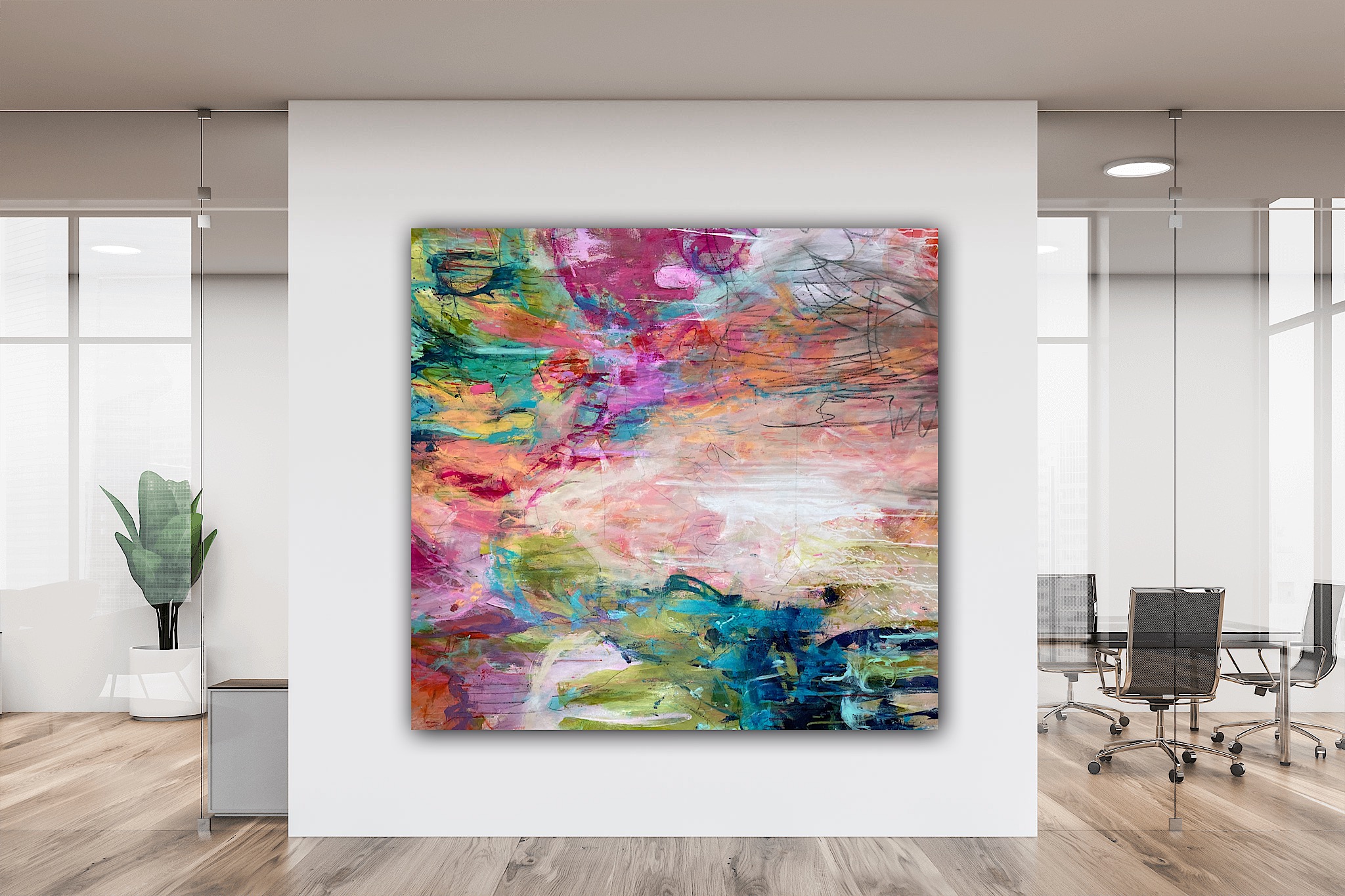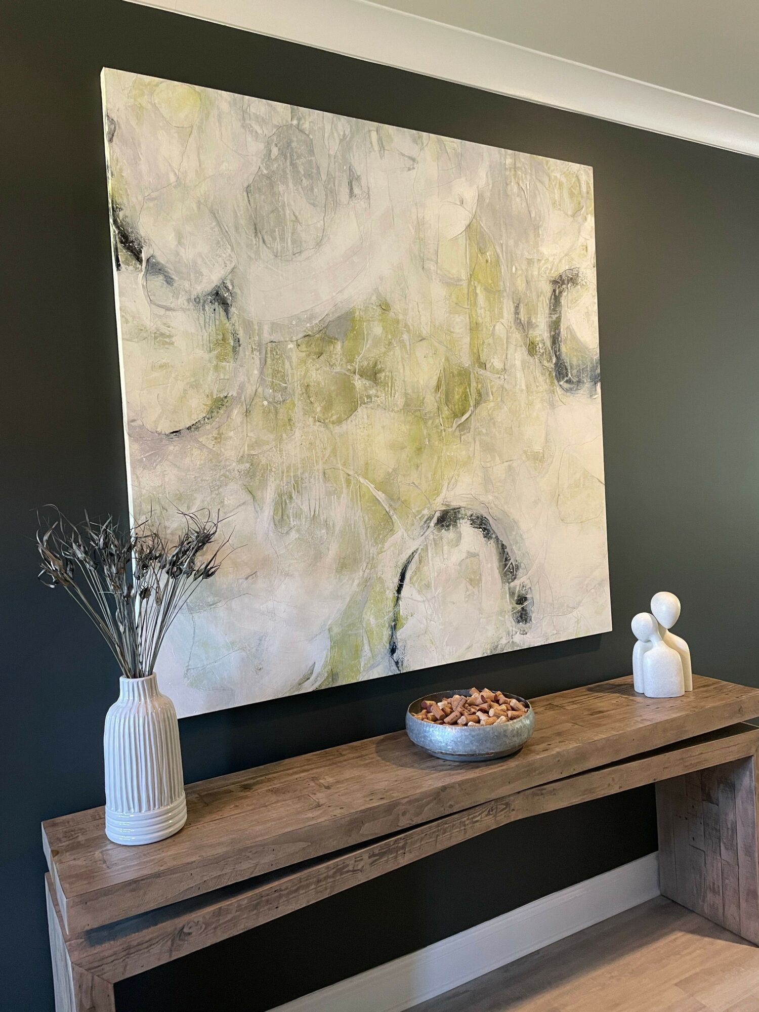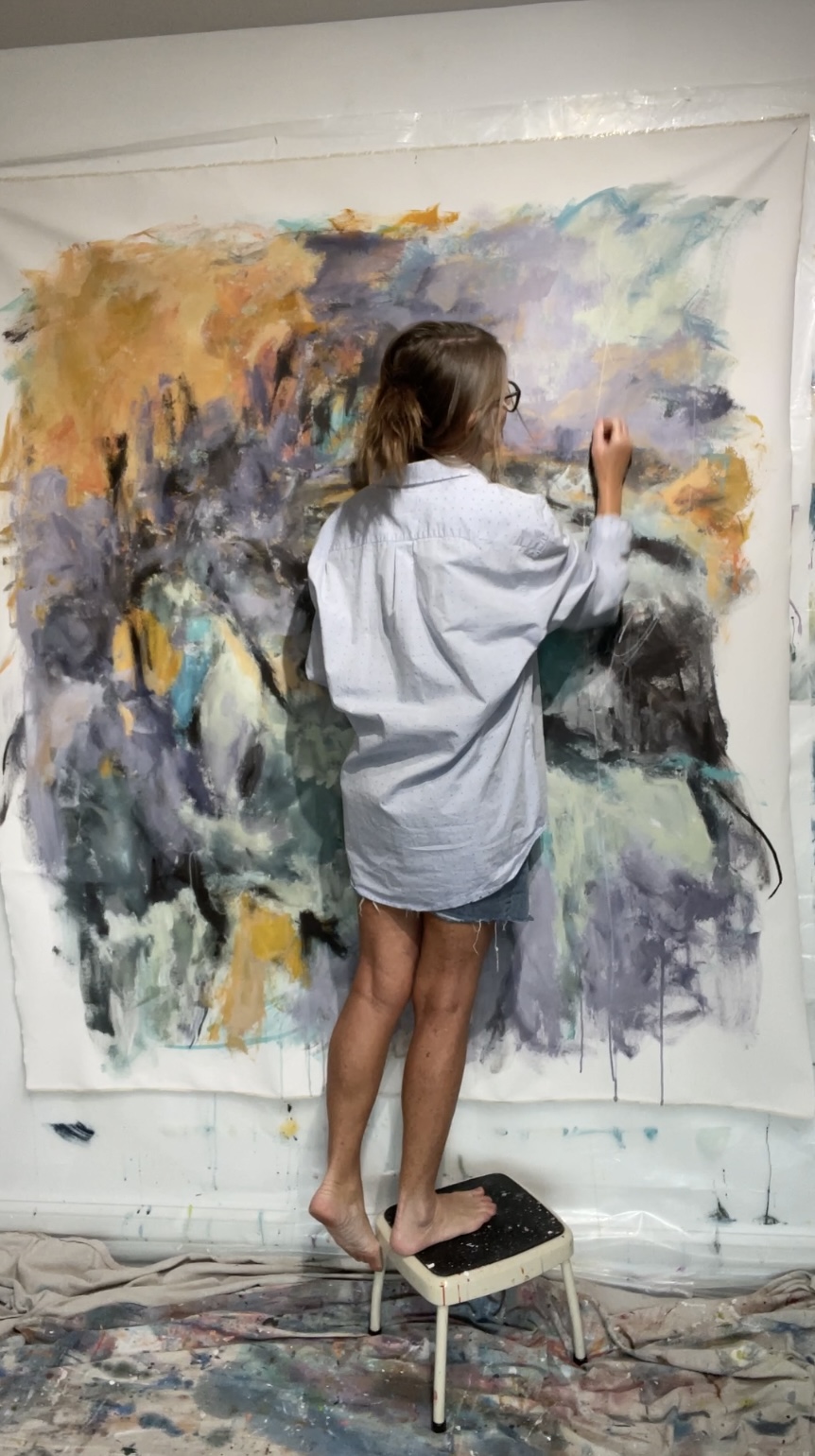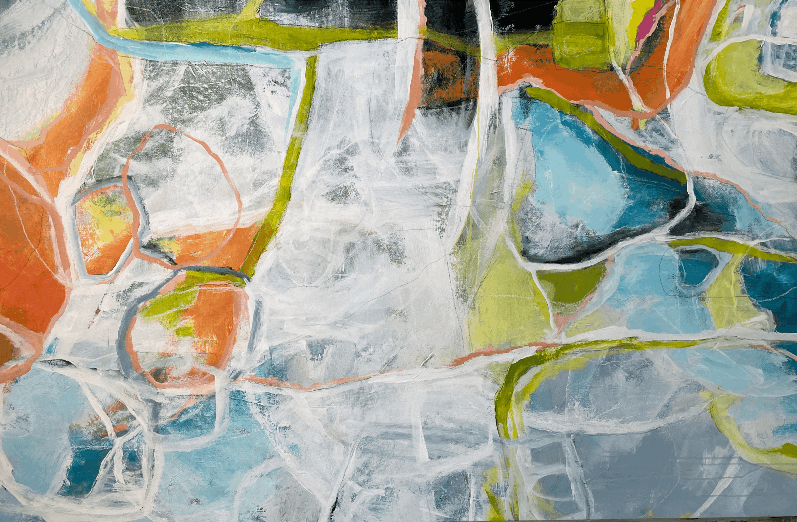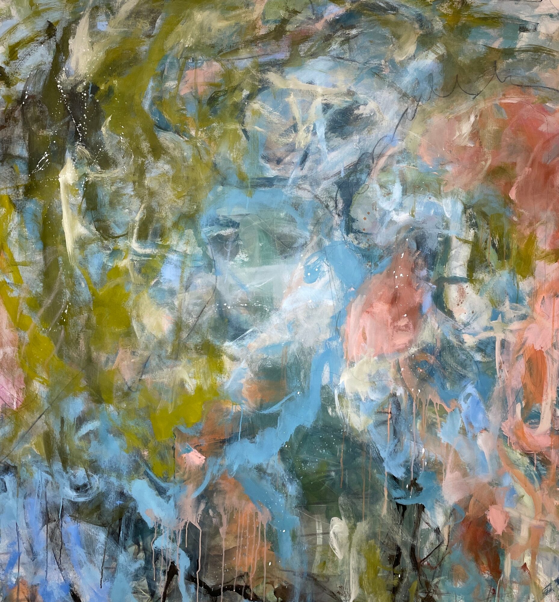 I paint intuitively. I create my art using acrylic paint and gestural strokes. I’ll start with strong lines, words, or marks and keep layering paint until my process reveals where the painting is headed. The layers are important to my work as that is how the story builds. There is a moment in this practice that guides me toward what the painting is needing from me. I’m learning and leaning more into artistic freedom and leaving overthinking behind. I want my art to be fluid, honest and raw, which I believe will tell its own story to each viewer, inviting them in and taking them on a personal journey.