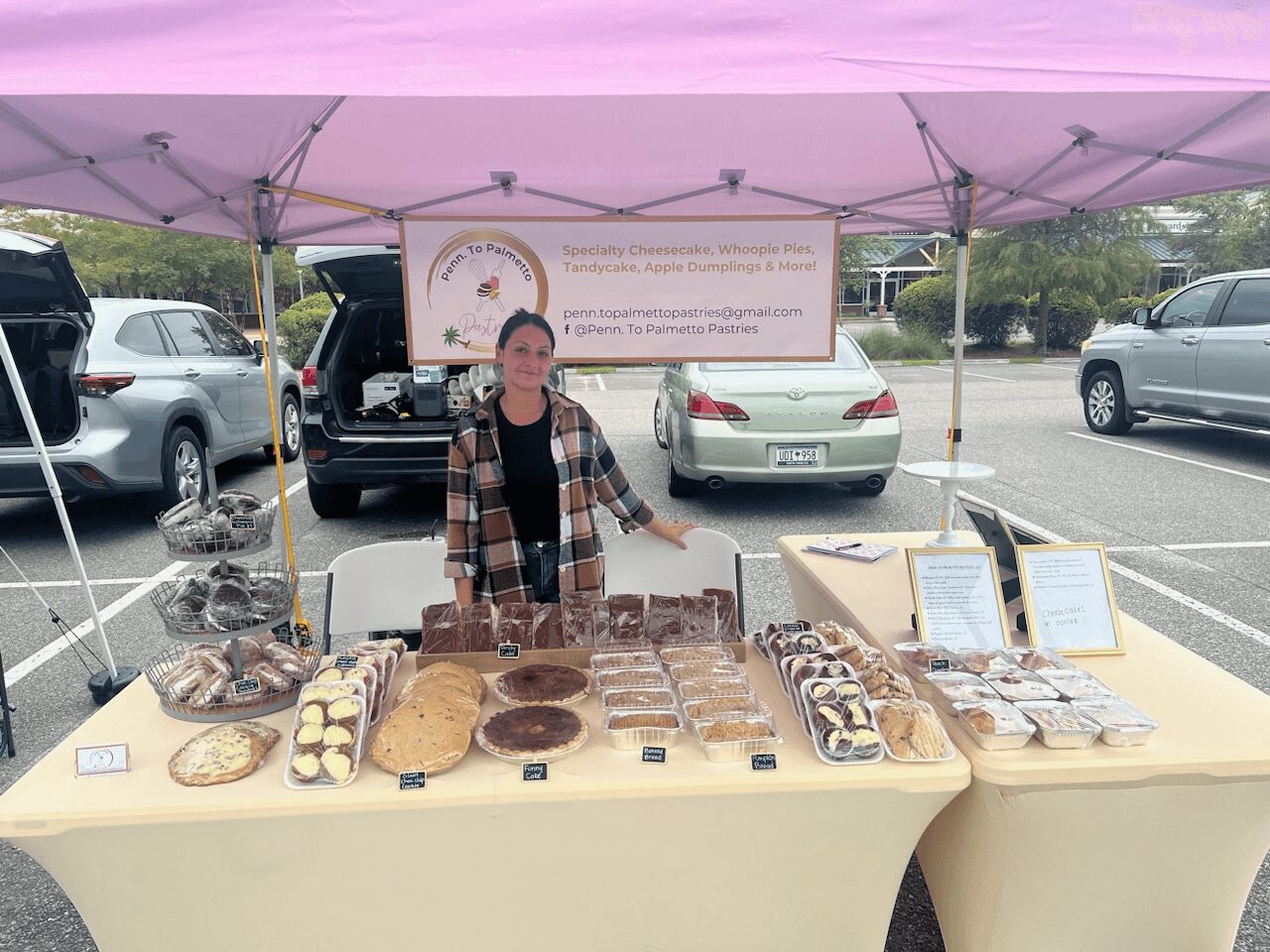 My business name Penn. To Palmetto Pastries originated because I’m from Pennsylvania and now live in the sunny Palmetto state. I specialize in all different flavors of cheesecake! Keylime being the number 1 favorite, followed by Reeses Peanutbutter. I also have a hand in the Pennsylvania Dutch recipes including Whoopie Pies, Apple Dumplings, Tandycake, Funny Cake, & Shoofly Pie just to name a few. I am at the local farmers market’s and always take online orders.