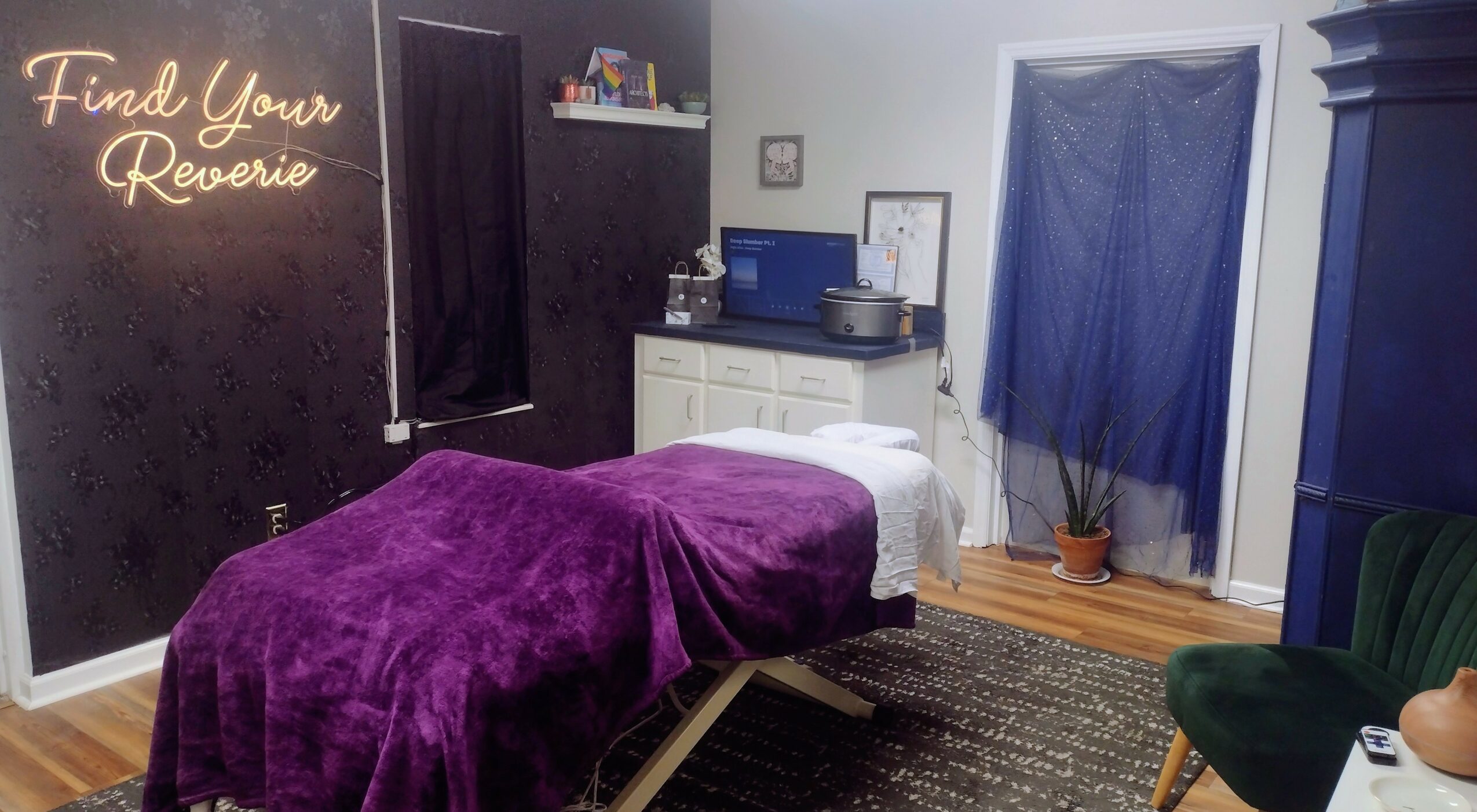 I love my new space and have worked really hard to capture my business’s namesake—Reverie Massage and Wellness—in the atmosphere and decor. To me, “reverie” is a state where you can drift off into sweet dreams or thoughts, leaving the outside world behind. I hope that is exactly what my clients find when they step through my doors.