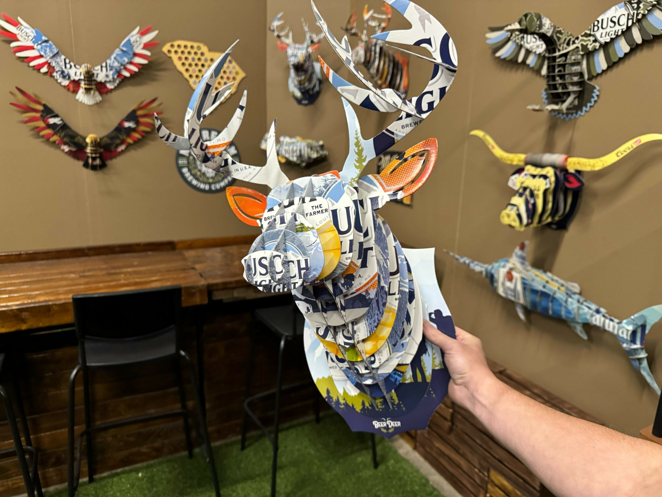 Beer Deer makes 3D taxidermy style animal mounts designed with the packaging of popular beer brands. Our mounts are sold and shipped flat and then assembled like a puzzle so it is a hybrid of an activity and DIY decor. We started with a simple deer mount but have expanded to offer a full line of animals and beer brands from land animals like Deer and Longhorn, to birds like Eagles or Ducks and even fish like our Bass or Marlin. We have also recently expanded beyond just making 3d cardboard wall mounts designed with the artwork of beer boxes, by introducing our line of stainless steel tabletop animal puzzles designed with the artwork from beer cans.
