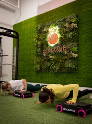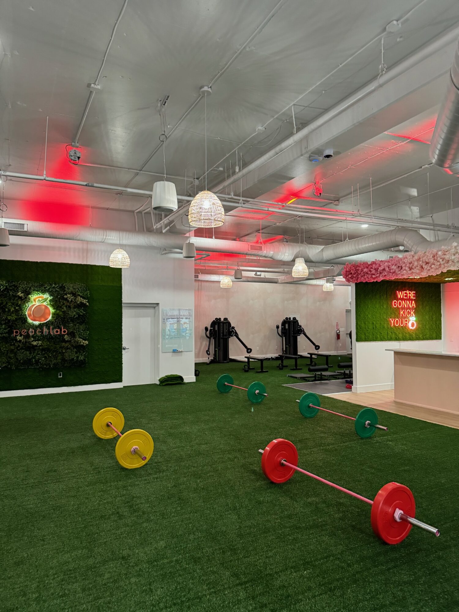 Peach Lab is a group fitness strength studio that prioritizes lower body strength and follows a split that spreads the full body volume out across the week so that you can come back every day. While our studio is very aesthetically pleasing and tailored to a more female aesthetic — it is no joke! We squat, deadlift, bench, and overhead press with barbells. We have cable machines, hip thrust machines, stair climbers, and lots of kettlebells and plates that allow each person who takes a class to be challenged.