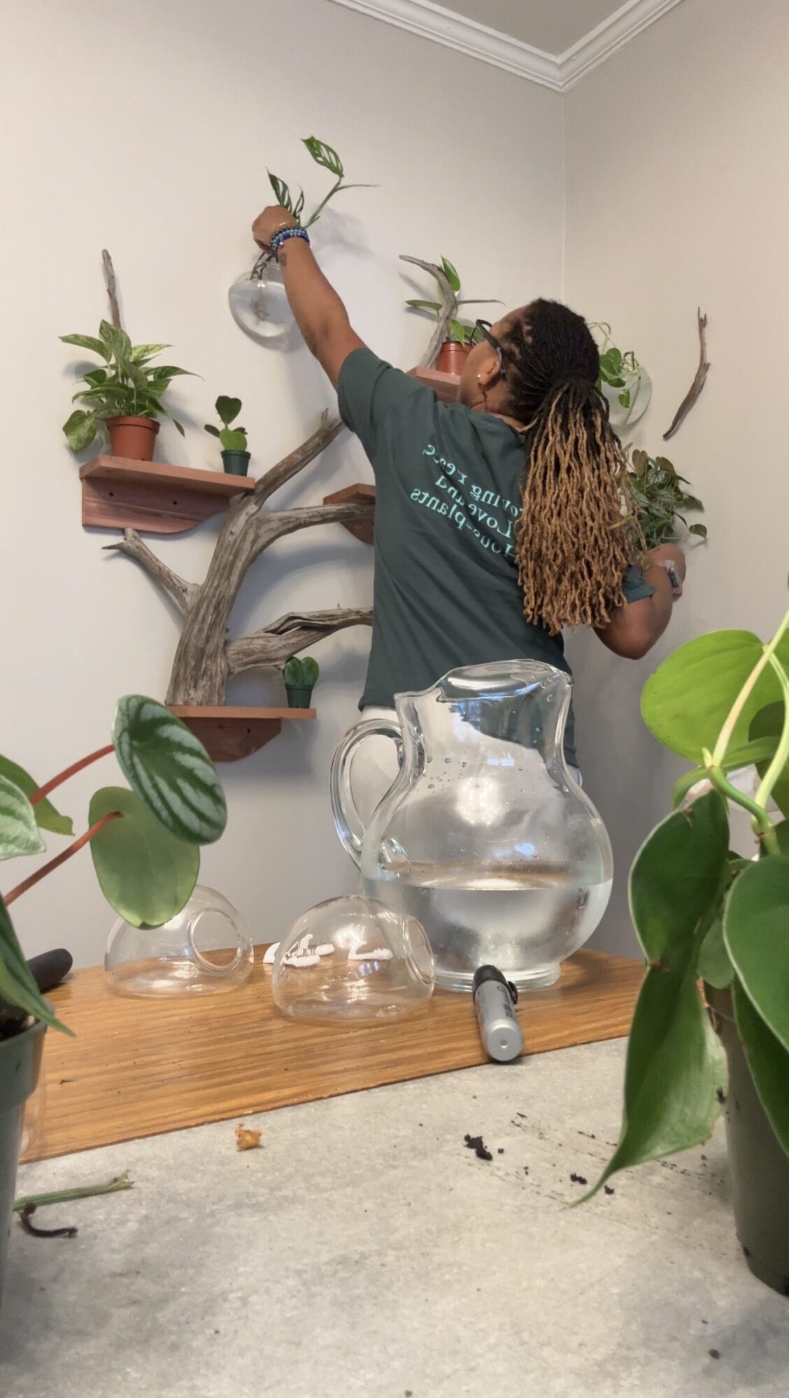 I am most proud of the custom plant wall. It’s art. Our plant chat was in home so I was able to access the client’s environment, assess the lighting opportunities, and gauge the client’s knowledge and capacity to be able to take care of the plant wall. We chose plants that were perfect for the aesthetic she envisioned and that matched her home and care needs. We created something beautiful that came from the vision and feeling of the moment. The wood placement, which plants were propagated in water, which would stay in soil, which plant would go where. I hadn’t often considered myself a creative or an artist but that wall is living proof that I am indeed both those things.
