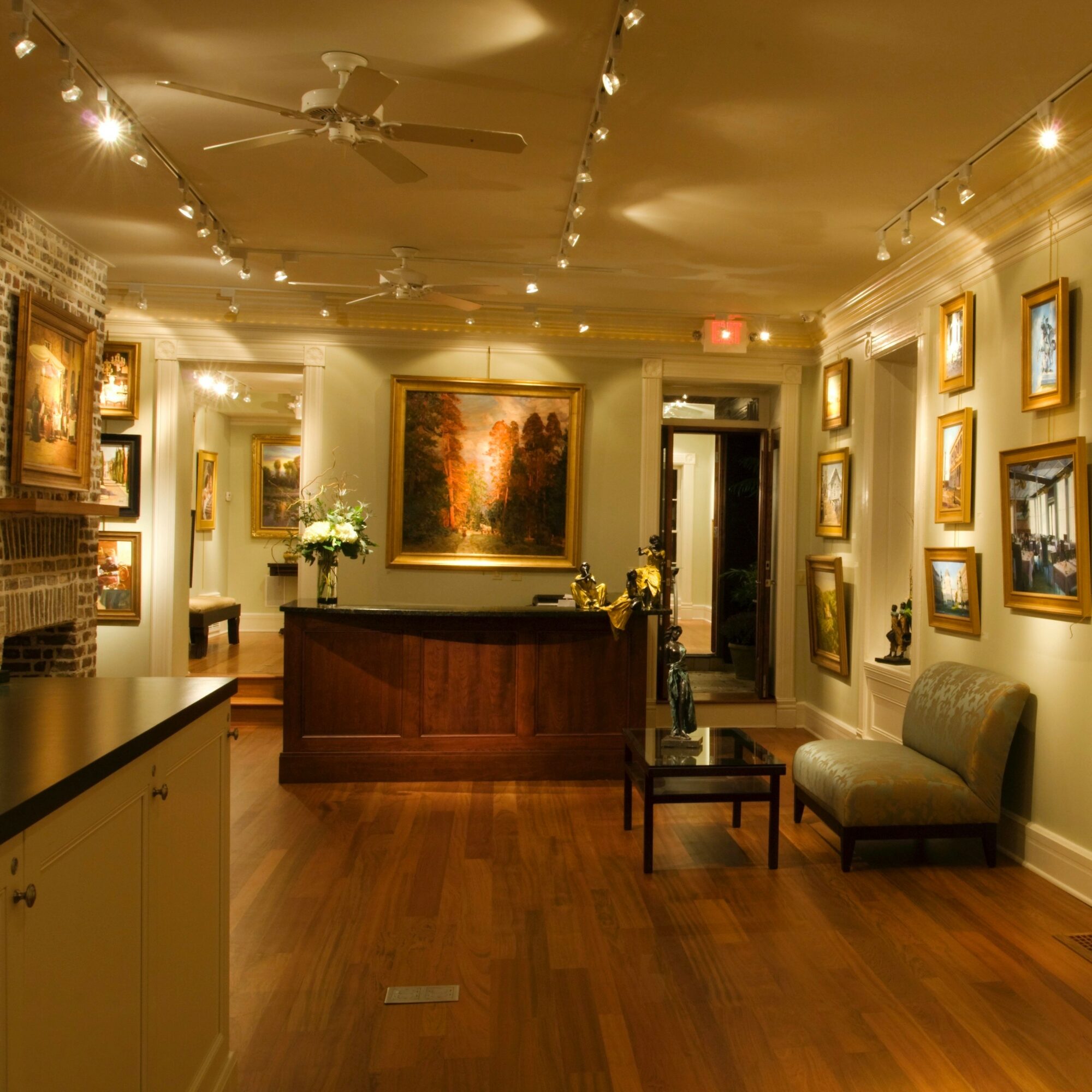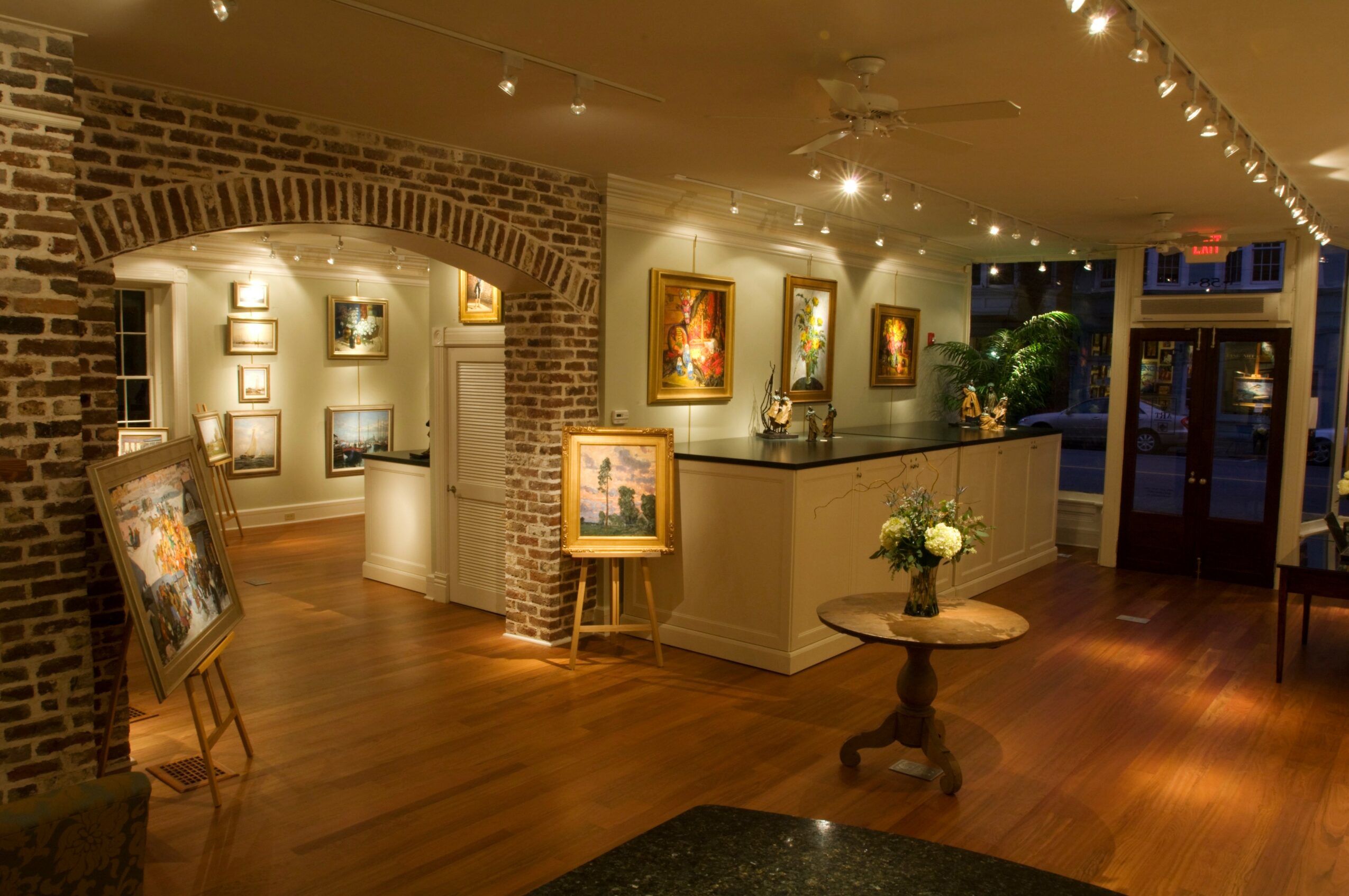 On November 2, 2001, I opened my own gallery with the vision of including renowned artist from around the world to Charleston. Naturally, I would be showcasing local talent but felt the need to expand Charleston’s art offerings to a clientele with more diverse interests. Visitors come from near and far and some may want a piece of the lowcountry to take home while others wish to find art that resonates from travels or an array of interest. In 2007 I came full circle to reside at 56 and 58 Broad Street, just next door to the gallery Doyle and I opened. My real estate partners and I renovated 2 offices to create a new gallery. We opened up the walls to expand into a stunning 3 room gallery space. It is filled with light, tall ceilings, includes 2 working brick fireplaces, a kitchen, marble bath with clawfoot tub, skylights and exquisite architectural details. My goal was to have a welcoming space that people felt at home and could relax while they immerse themselves in the eye candy on the walls. I am blessed to continue to have an enormous passion for my vocation.