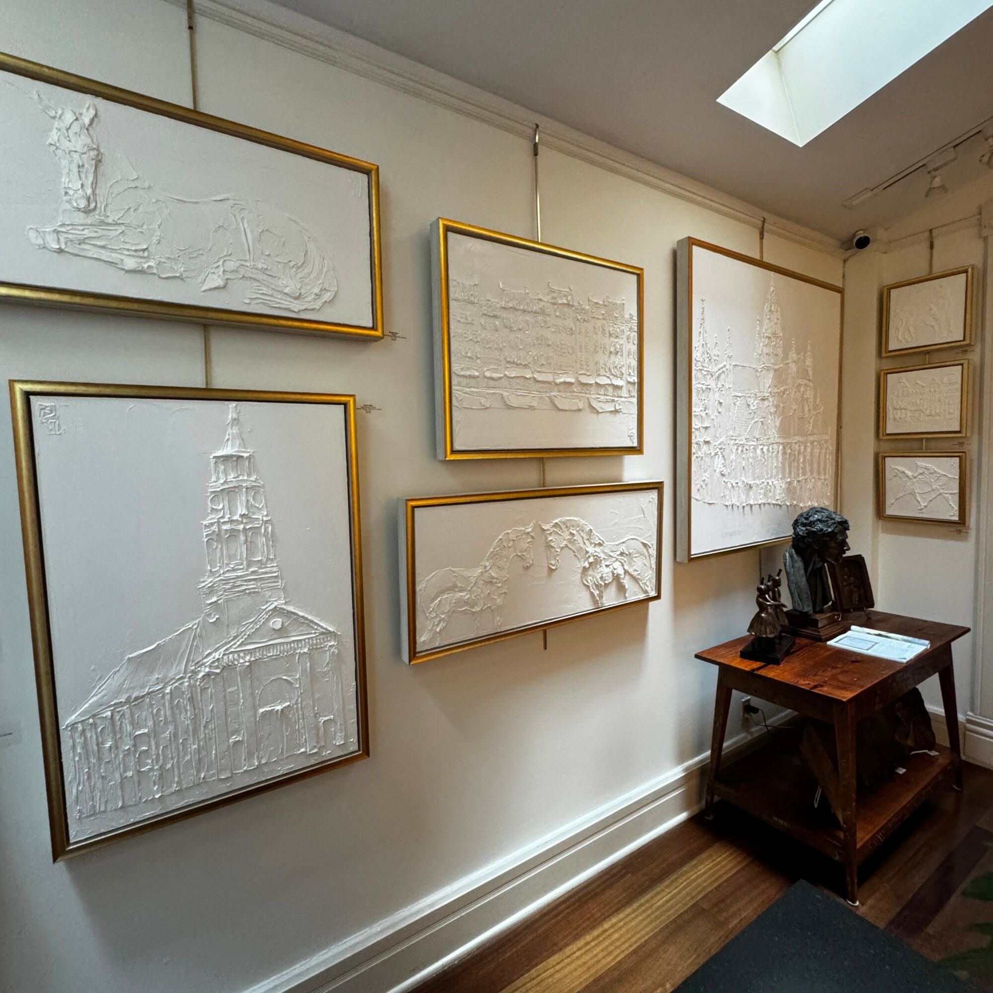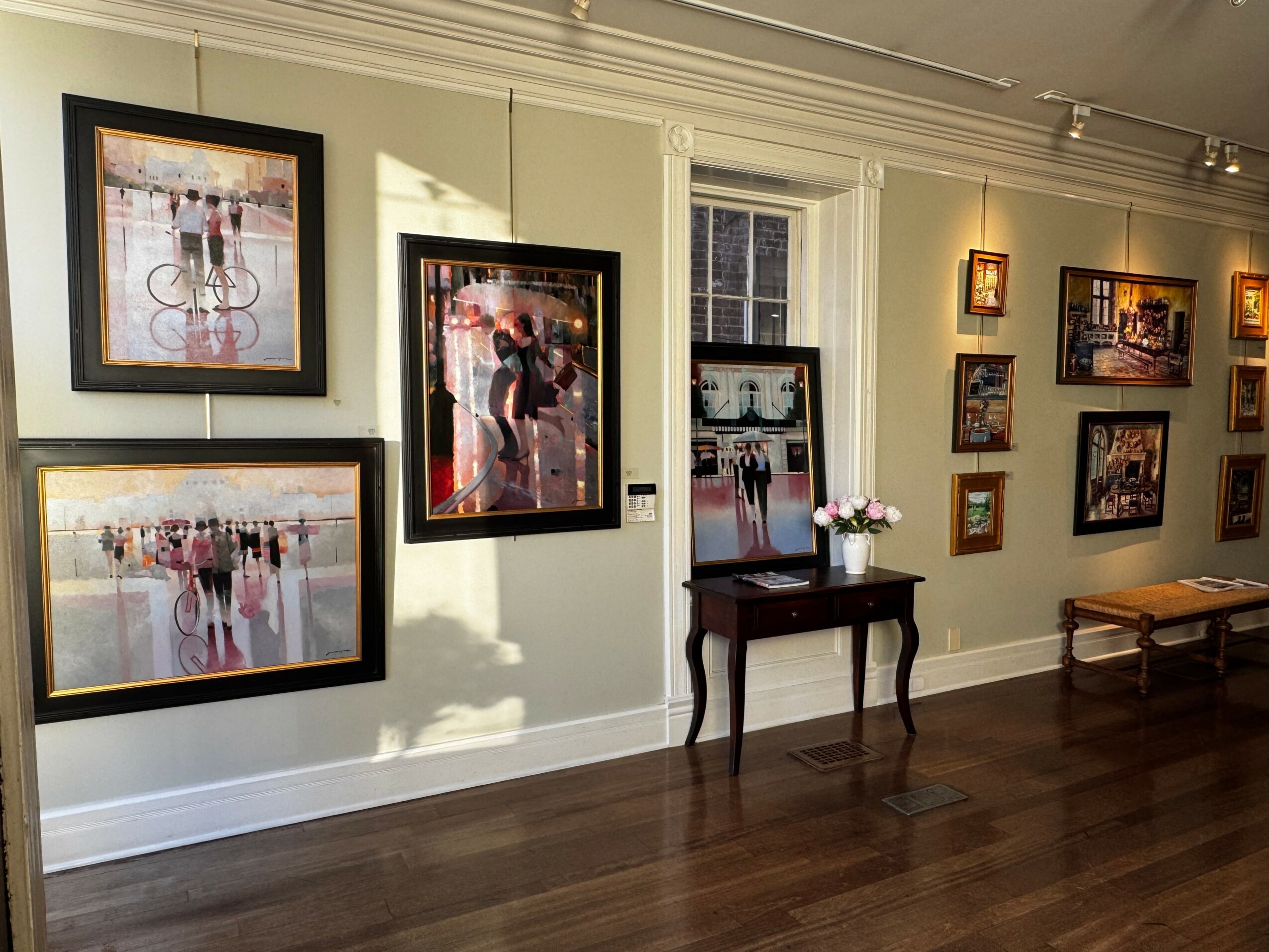 Currently, I am proud to represent over two dozen artists. Offering works that are both an investment and art that can quench the soul and bring beauty and life to the collectors home or office. The quality works we showcase are paintings, porcelains, jewelry and bronze sculptures by the legendary Glenna Goodacre. The styles and subject matter range from traditional to abstract. I feel incredibly honored to represent so many award winning artists from around the globe. The gallery has detailed elegant French interiors by California artist Lindsay Goodwin as well as European and lowcountry scenes by her college professor Craig Nelson. He is the head of the art department at the Academy of Art University in San Francisco. Both of these artists as well as more than a dozen have been working with me for over 20 years. Aleksander and Lyuba Titovets, Evgeny and Lydia Baranov and Jeff Jamison to name a few. Jamison is one of the few local artists represented in the gallery He ended up moving to the Charleston area about 10 years ago. I started representing him around 2003. He told me he had read an article on the gallery in a national publication and told his wife that they were going to Charleston to meet the owner. He knew this was the gallery he wanted to have represent his works. As they say the rest is history. He has been a sensation and continues to evoke delight with his viewer in the dreamy city scapes and beach scenes he is famous for. Another artist from Normandy, France that I started showcasing four years ago is Brooke Major. She grew up in northern Georgia but moved to France during her college years to pursue an art degree in Paris. She fell in love and has lived abroad ever since then. She and her family have a horse and cattle farm on the coast by Omaha Beach, France. She returns to bring new works to the gallery every 3-4 months. Brooke’s style is unique as her canvas is completely white with her subjects being sculpted with a palette knife. The effect leaves one speechless. Her subject matter varies from architectural to equestrian. We also have floral abstract by Texas artists Mallory Agerton and Deborah Paris. Both of these ladies also paint impressionistic and realistic landscapes.