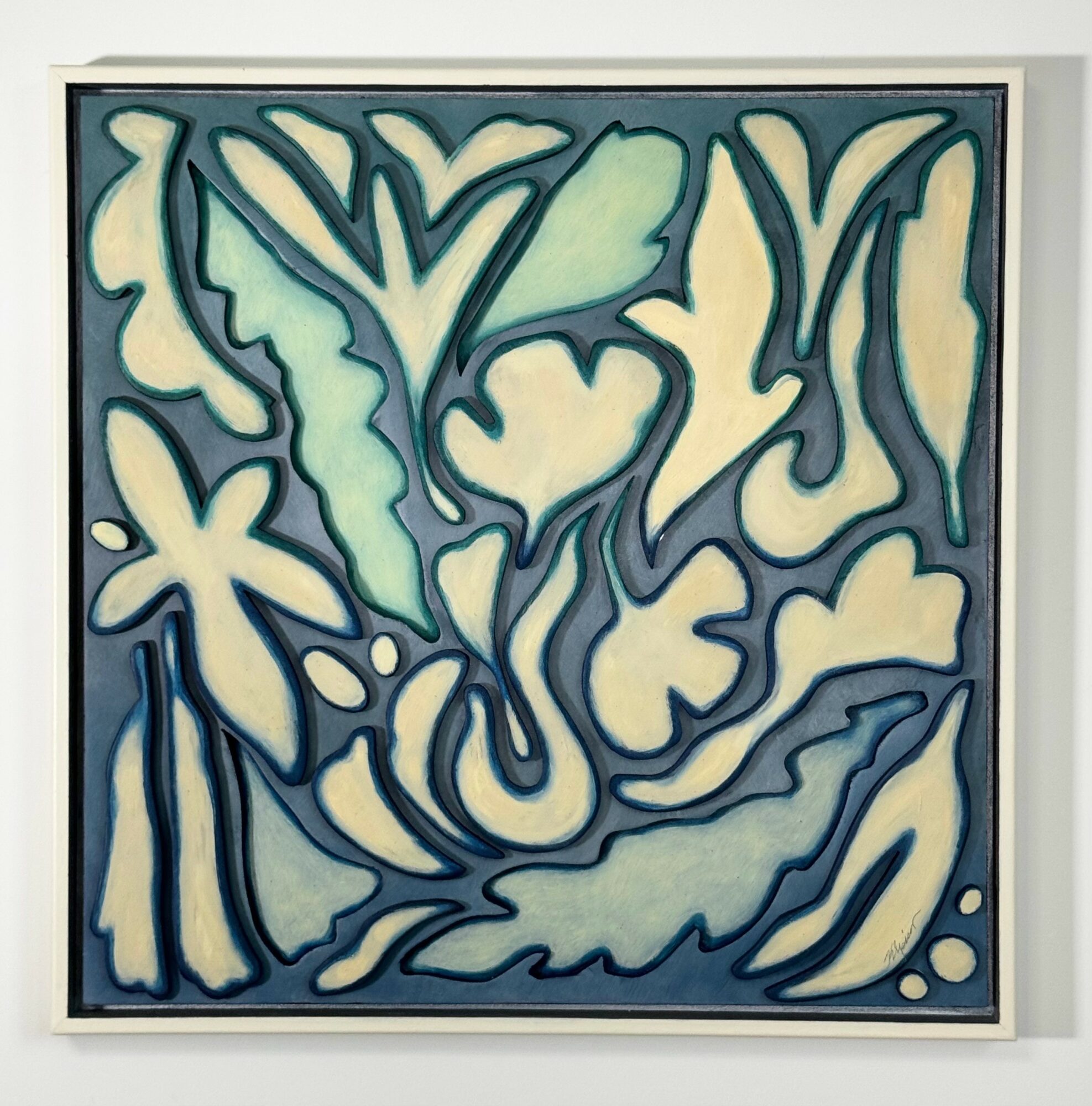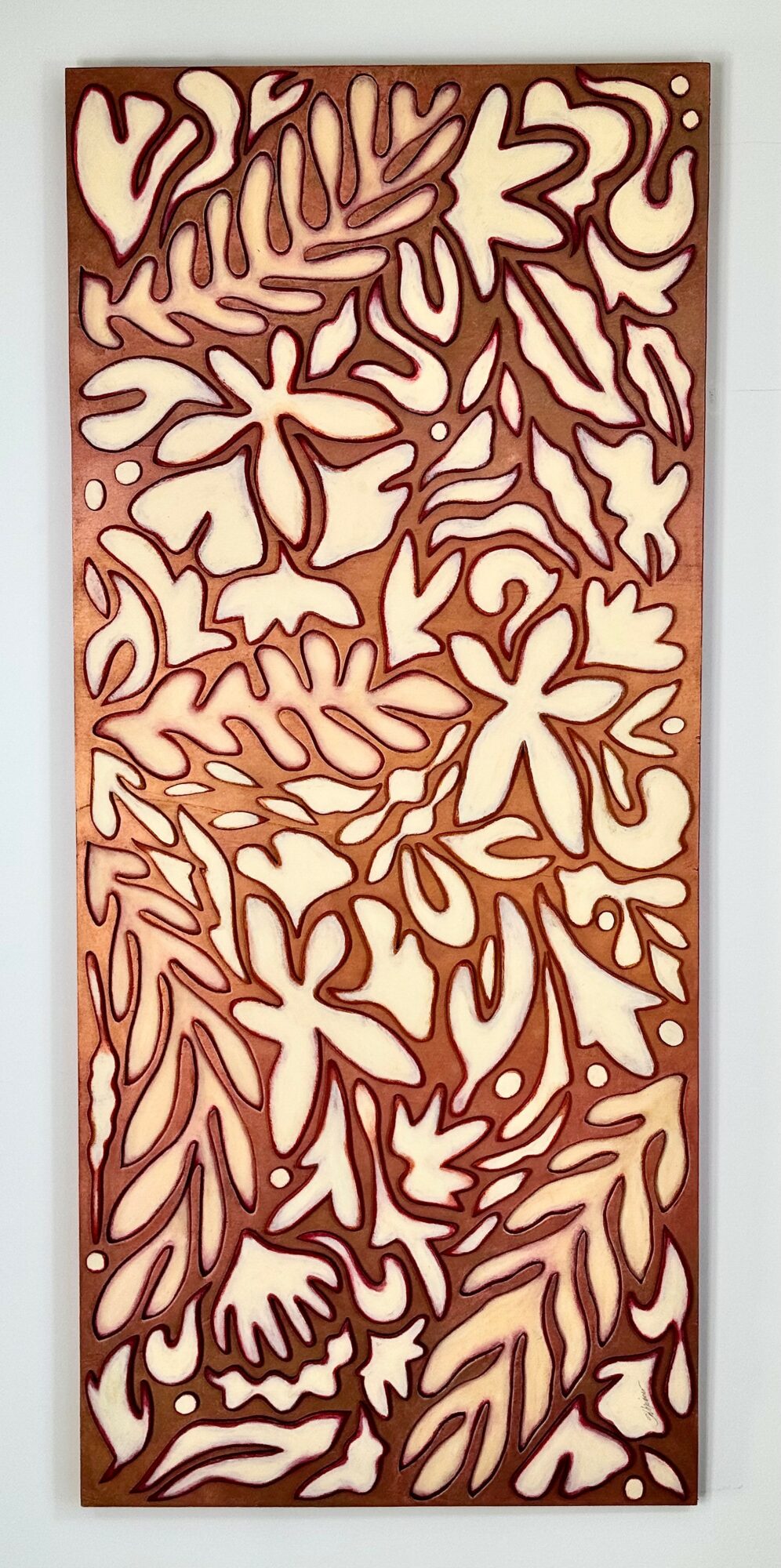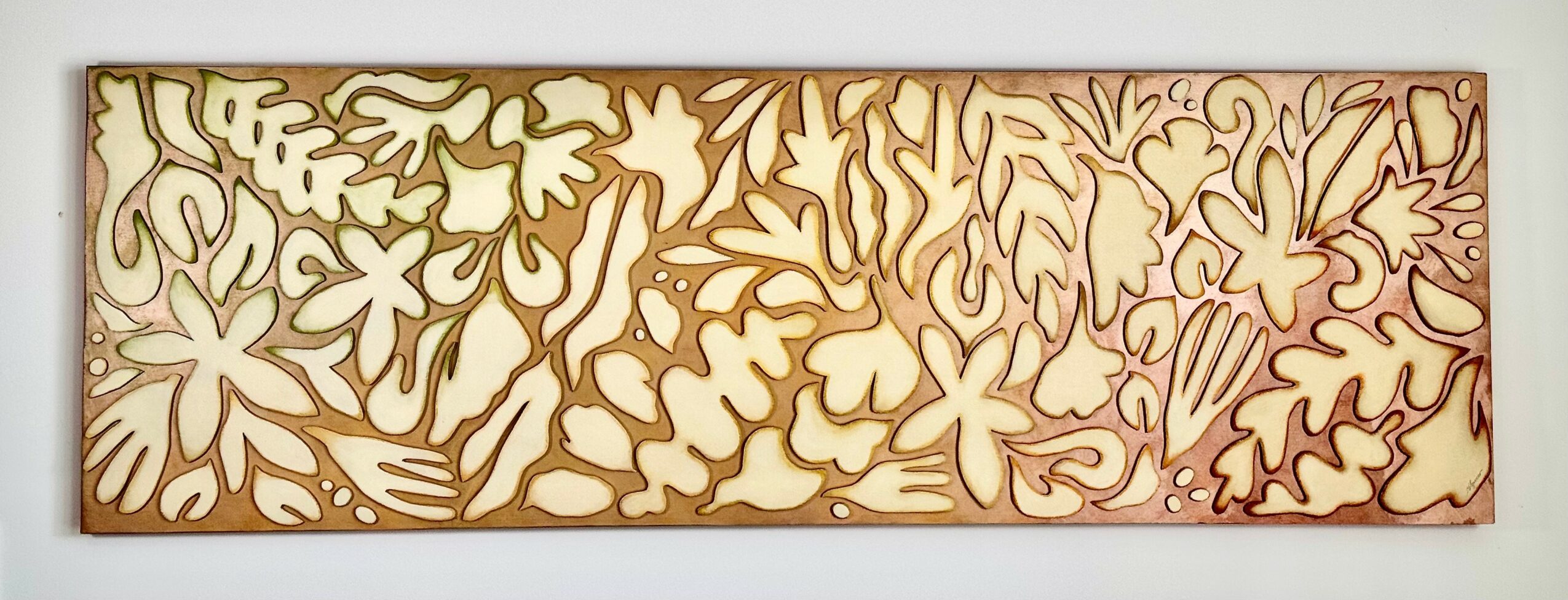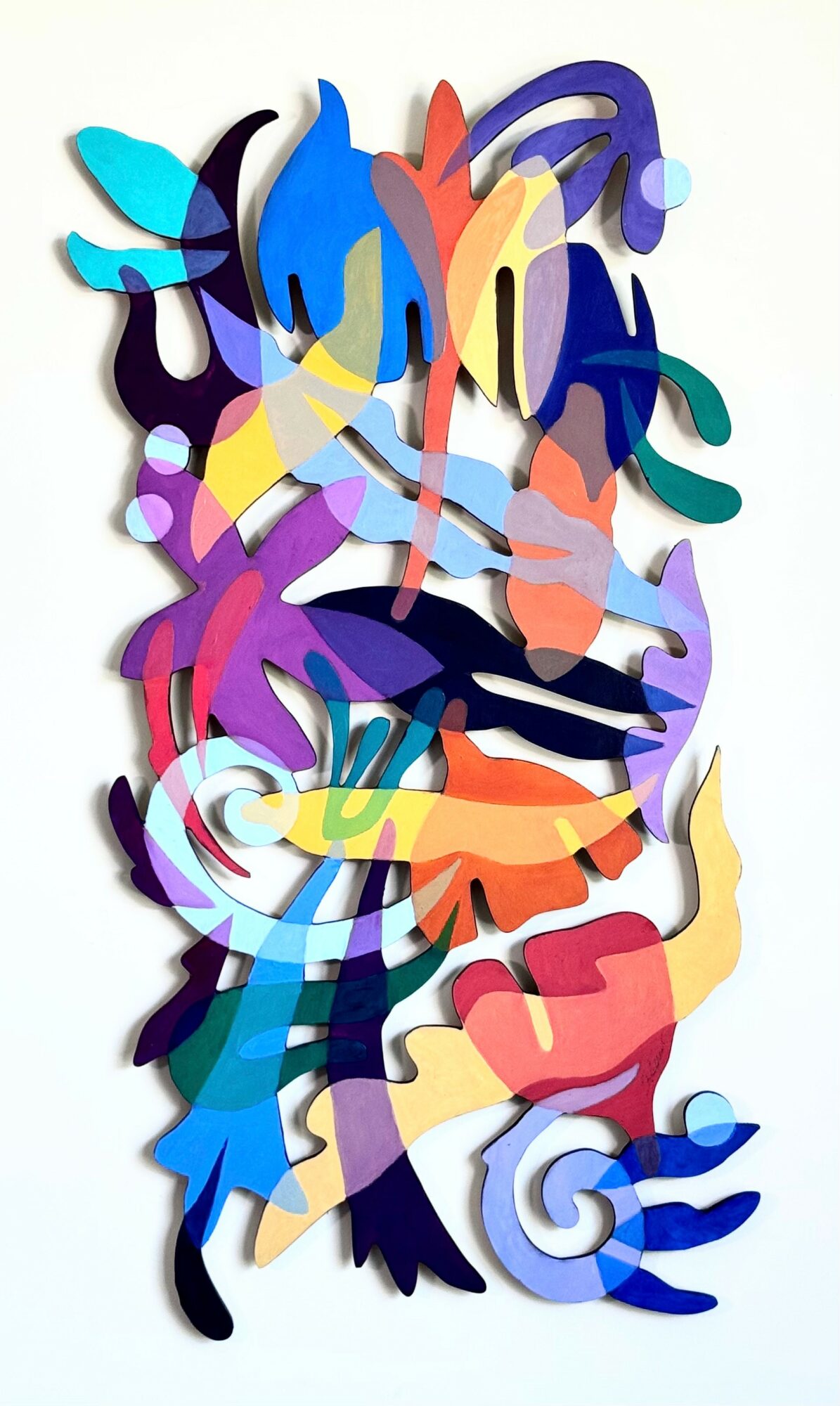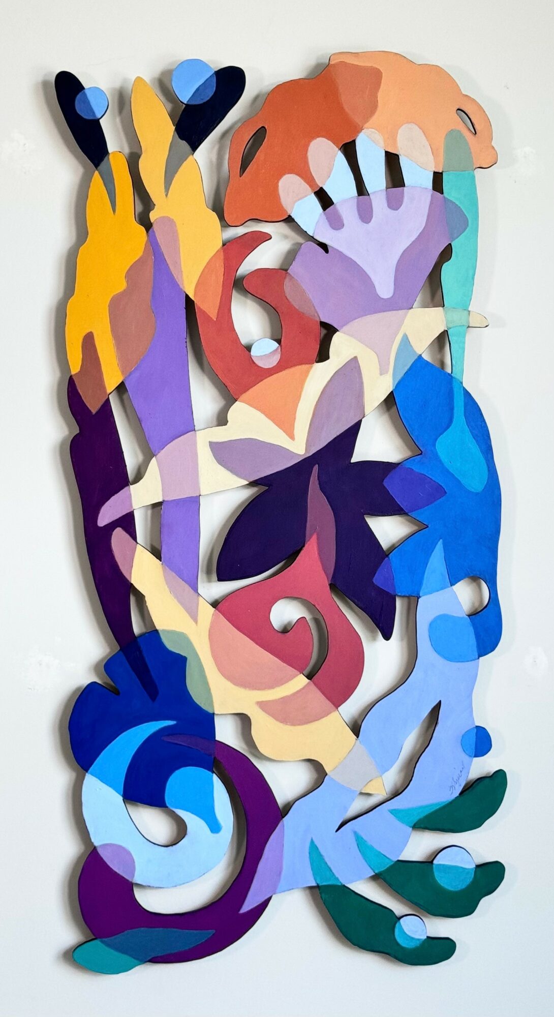 I make unique cut out paintings using birch plywood and layers of oil paint. These paintings sort of defy category as they are a hybrid of painting and sculpture. The work is semi abstract with reference to nature. It is very rhythmic and has a lot of energy.