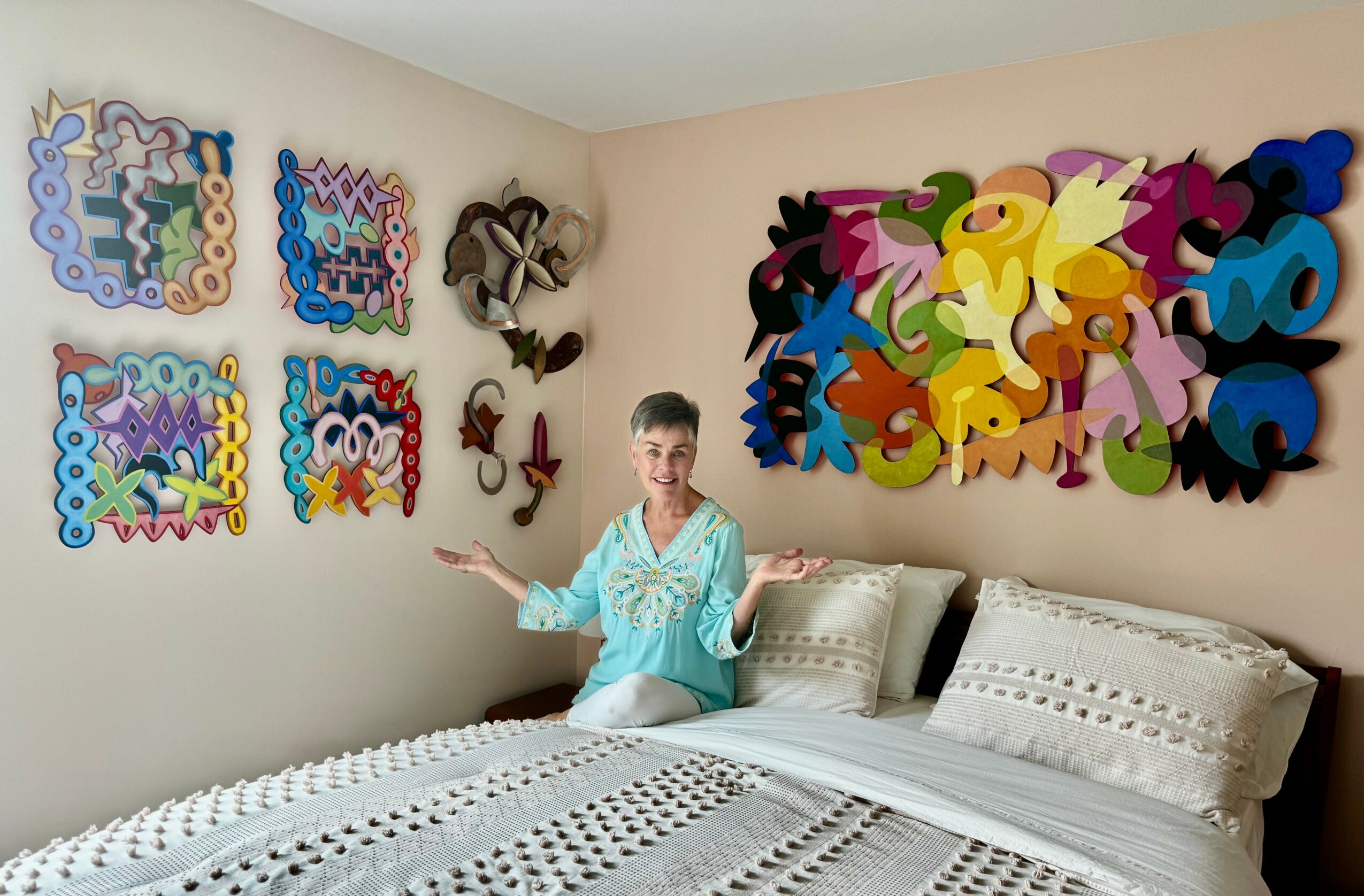 I have been a professional artist exhibiting in galleries and museums for about 40 years. A graduate of Parsons School of Design in New York, I resided in New York City until 2009, and then moved to the Philadelphia area, where I continued my practice making wall hung painted wood sculptures. In 2023 my husband and I decided to moved to South Carolina after visiting several different locations. We were drawn to the beauty, the weather and the nice people we encountered. Once we chose Conway, I immediately set up my new studio space in our new home. My work changed, partly due to our “downsized” home, but I continue to make cut out wood paintings using mostly birch plywood with layered oil paint. These paintings are a hybrid of painting and sculpture. I was fortunate to find a wonderful art community, some very good friends and 2 galleries to show my work. The William Miller Gallery is located at 702 8th Ave in North Myrtle Beach, and the Sunset River Gallery, located10283 Beach Drive SW in Calabash, NC. I continue to draw inspiration from my new surroundings, the colors and shapes found in nature, the ocean, and the serenity of the warm weather, beauty and big open skies.