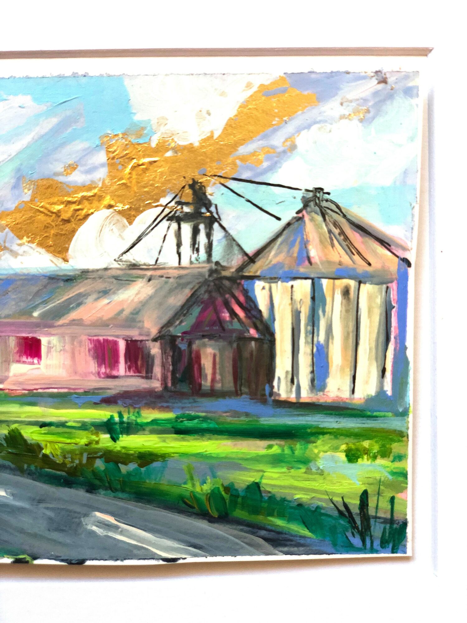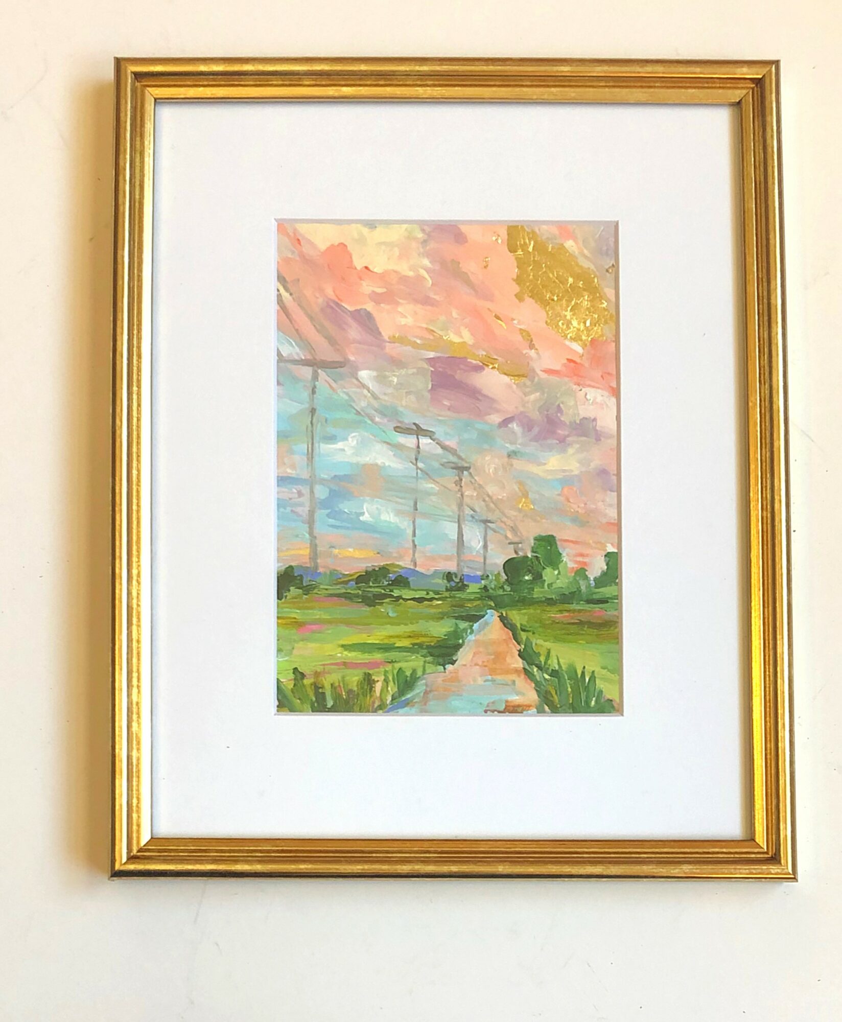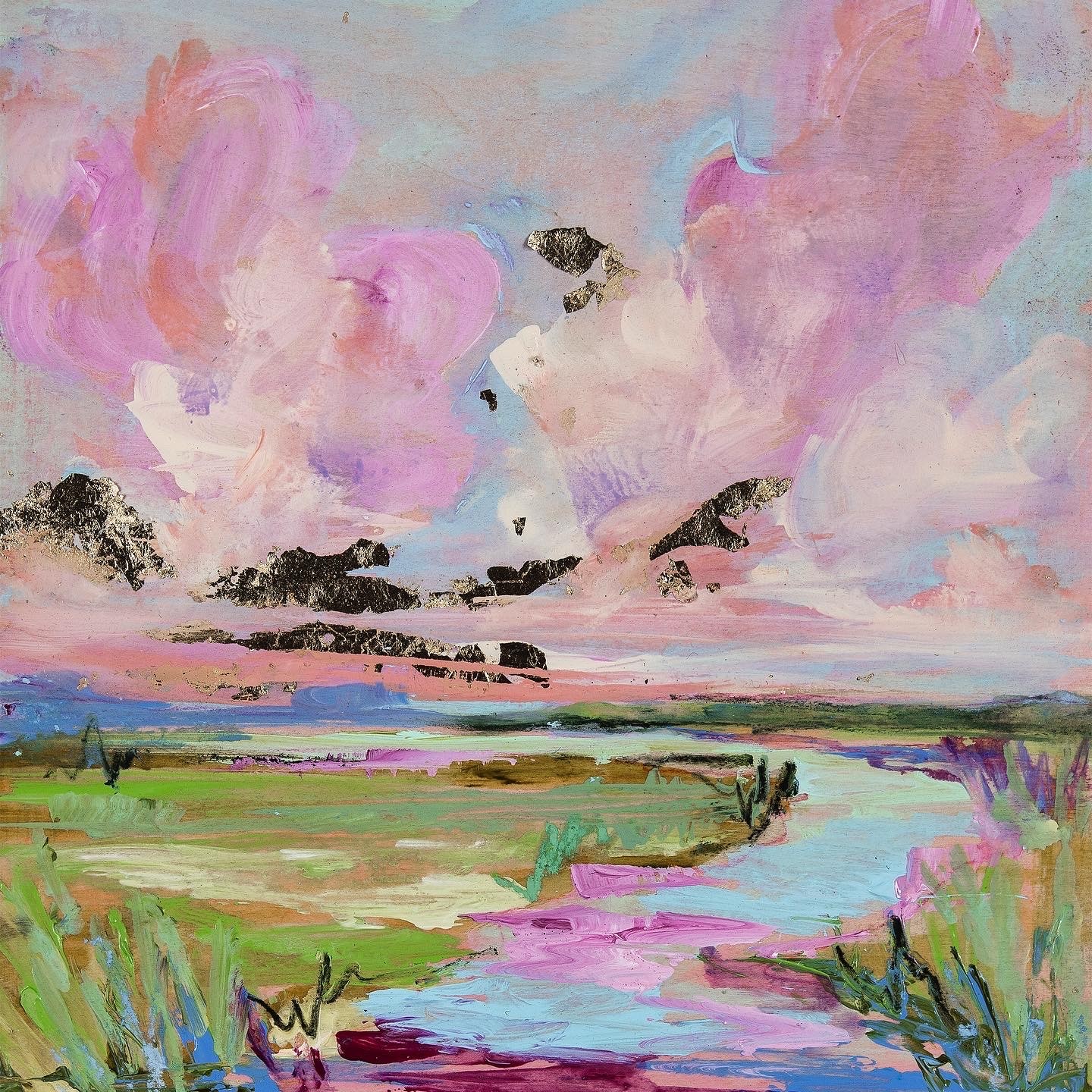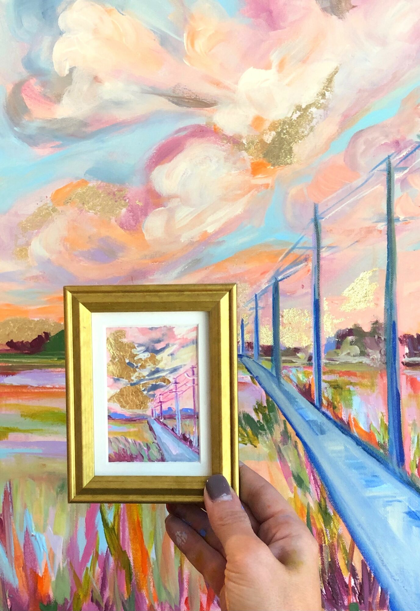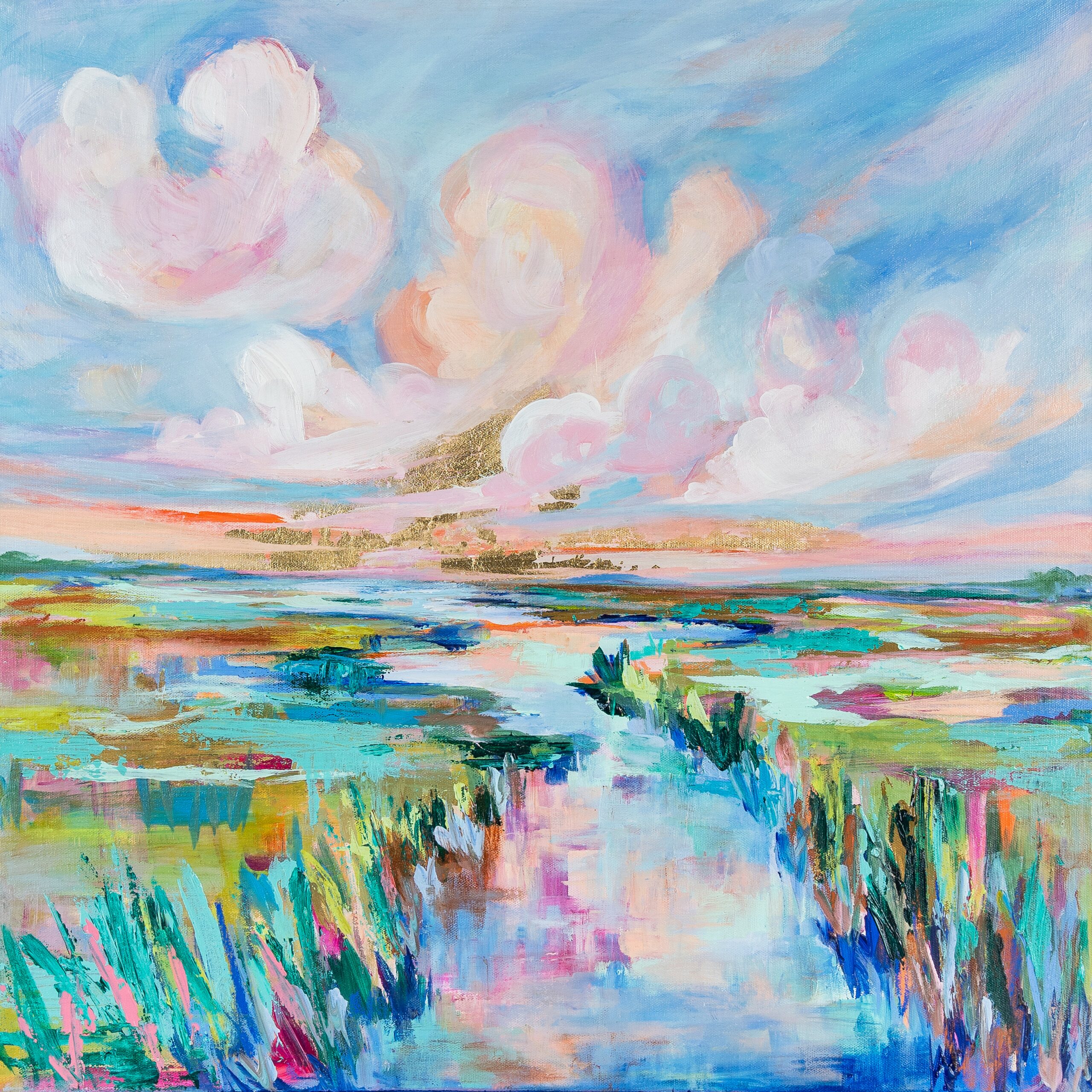 I create bold and colorful waterscapes and landscapes. I use mostly acrylic paint and often mix in metal leaf, pencil, and oil pastel details. I am inspired by both God’s handiwork- namely coastal landscapes like marshes, the ocean, sunrises, and sunsets- as well as the abstract shapes of man-made architecture (bridges and buildings). Every day presents me with new color palettes, new visions, and new ideas for my artwork. My creative vision is not to interpret nature realistically as we see it but rather offer nature as I feel it. Through bold colors and rich texture, my goal is to transport you to a place of peace and wonderment so that together, we can appreciate the beauty of the earth.