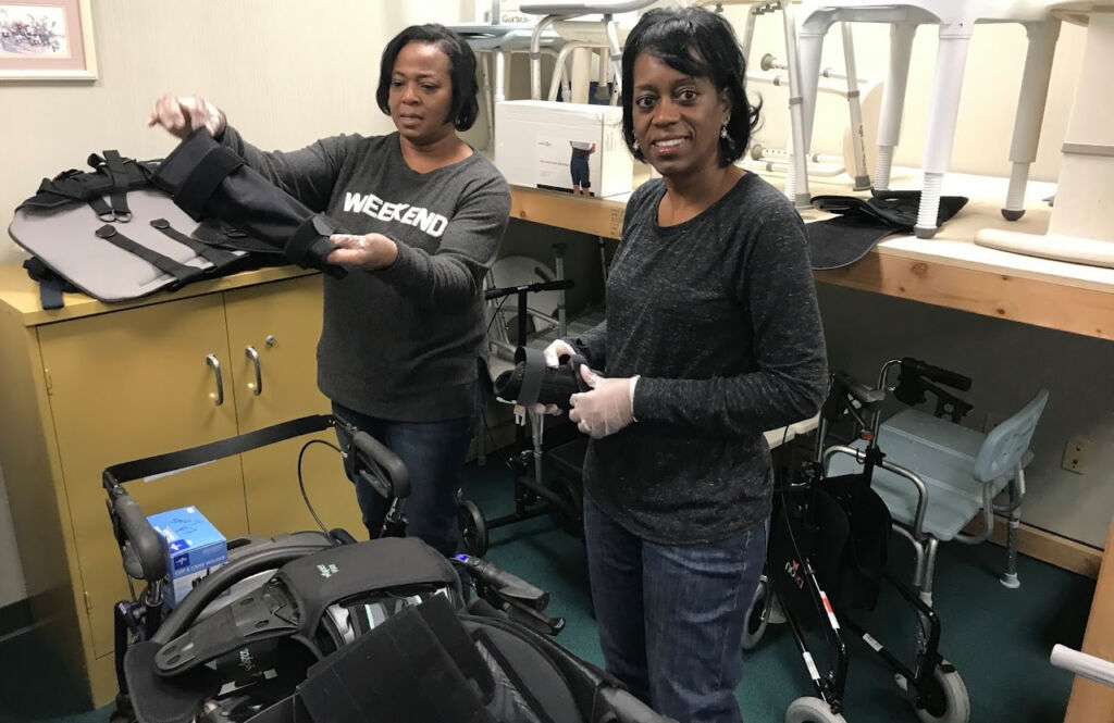 Arm platforms, bed pans, bed support rails (bed canes), bed trays, bedside commodes, bedside tables, various braces, canes (regular, quad and hurry), cast boots, crutches (aluminum and forearm), dressing sticks, various exercisers (including pedal exercisers), foot baths (occasionally), gait belts, reachers/grabbers, patient lifts with slings, shoe horns, handheld shower hoses, shower seats (with or without backs), transfer sliding boards, sock aids, elevated toilet seats, toilet support rails, travel transport wheelchairs, tub support rails, tub transfer benches, weights, regular wheelchairs and walkers (folding, hemi, winnie and rollator).