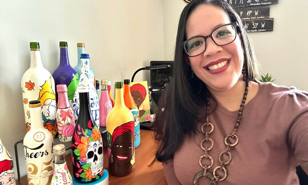 I began my journey of art and craftsmanship in my home country of Colombia, home to many vibrant colors and cultures. Learning from family and friends in the neighborhood, I developed my skills in crocheting and painting from an early age. My father was a music and art professor at the local university while also creating art for local ad agencies, and he spent many hours passing on those skills to my siblings & me. While I spent days and weeks assisting with mural projects for local schools and businesses, a relative suggested that I scale down to bottles. Painted wine bottles became the item I would sell the most, thanks to my brother’s former boss, who asked me to design one for her niece’s wedding. As for crochet and clothing alterations, I was pulled in that direction, just spending time at the homes of extended family. It quickly became a pastime of harmless gossiping, and the skill of crocheting was just a byproduct. After a few years of developing muscle memory, I could crochet a blanket while watching TV or talking with friends and rarely had to look down to check my pattern.