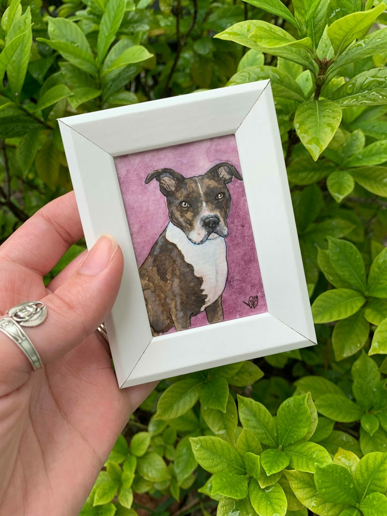 I am an artist that specializes in animal portraits and commissions. I could never choose just one medium to work in, but I’d have to say my favorite is watercolor. I love the way the paint flows and dries; it’s always so different from how it looked wet. I have always had a love for nature so there was definitely more gravitation toward creating pet and animal portraits. I have been known to do portraits of people and architectural paintings in the past but I really love the forgiveness of painting the likeness of a pet over a grandparent or a child! I think because I am always adding new mediums and tend to paint in a more illustrative style, my work lends itself to having a little more personality than just a photo-realistic portrait. I especially love when there is a story behind the subject, so each piece is like its own little fairytale. I am always so proud when someone receives their commission and I get messages of how much they love it. I’ve even received a few videos of my paintings being given as gifts and that is always so incredibly special.